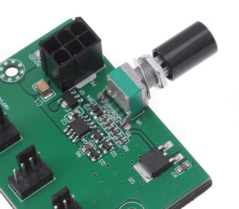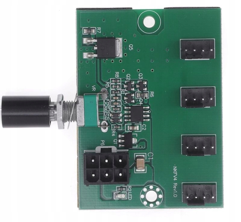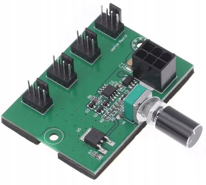 Дистрибьютор для подключения до 4 3/4 вентиляторов. Он имеет 4 4 4-контактных разъема и источник питания из порта 6PIN PCI-E. Одна ручка вращения. Вентиляторы могут быть отключены, 0% диапазон регулировки скорости - 100%. На задней части адаптера есть клейкая лента, которая будет легко и, вероятно, прикрепит плитку к корпусу компьютера. Контроллер для правильной работы требует, чтобы используемые вентиляторы имели функцию регулирования ШИМ