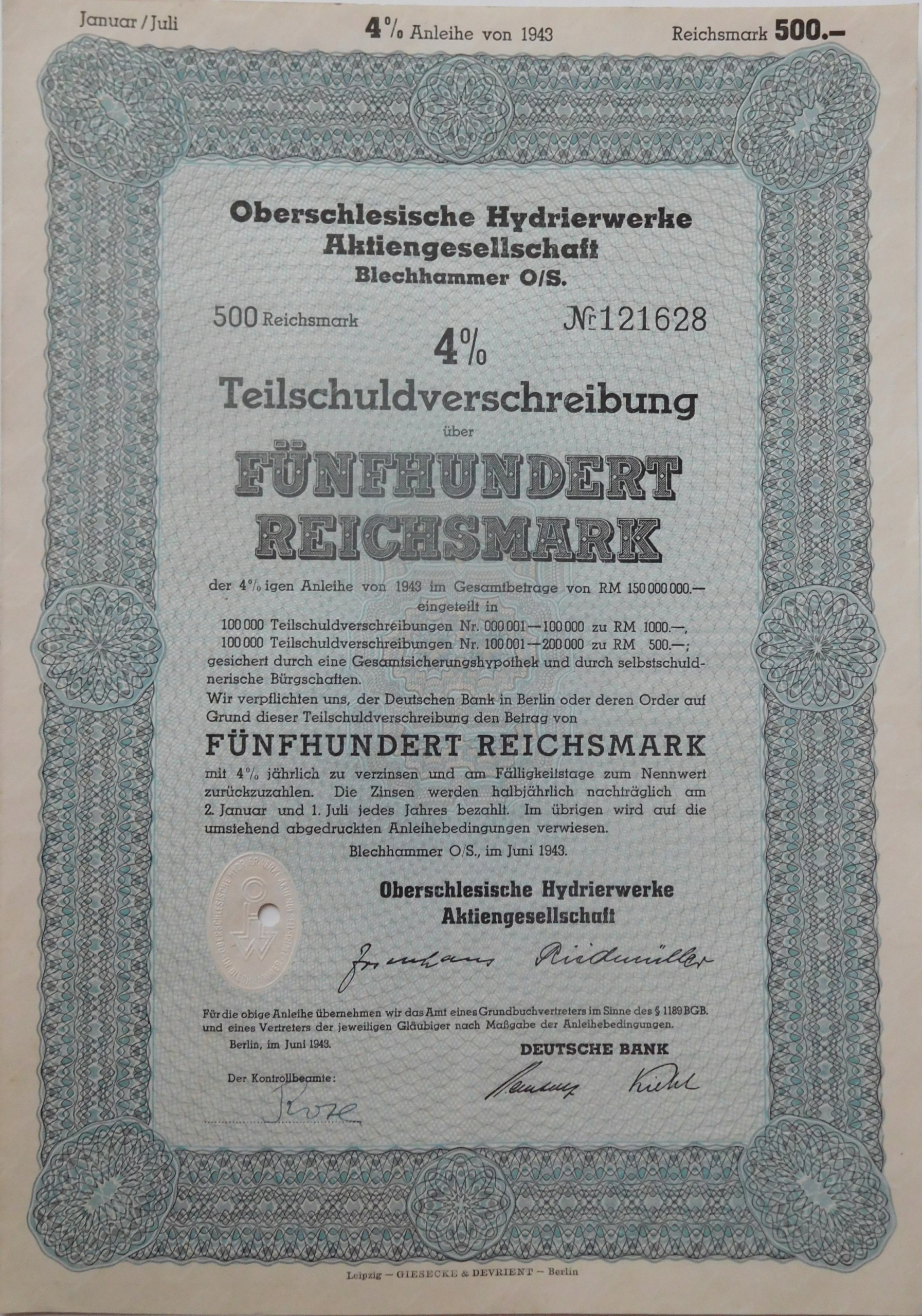 Номинальная стоимость: 500 рейхсмарок