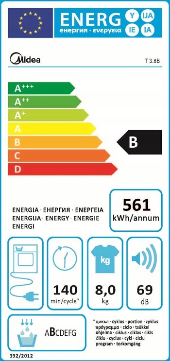 Сушилка для белья Midea T 3.8B представляет собой конденсационную сушилку вместимостью 8 кг. Устройство имеет функцию задержки запуска и выбора времени сушки, что позволяет настроить работу сушилки под индивидуальные потребности пользователя. Панель управления с дисплеем обеспечивает простое и интуитивно понятное управление. Безопасность использования обеспечивается дверным замком. Сушилка относится к классу энергоэффективности B, ее годовое потребление энергии составляет 561,00 кВтч. Уровень шума при сушке составляет 69 дБ, что обеспечивает комфорт использования.