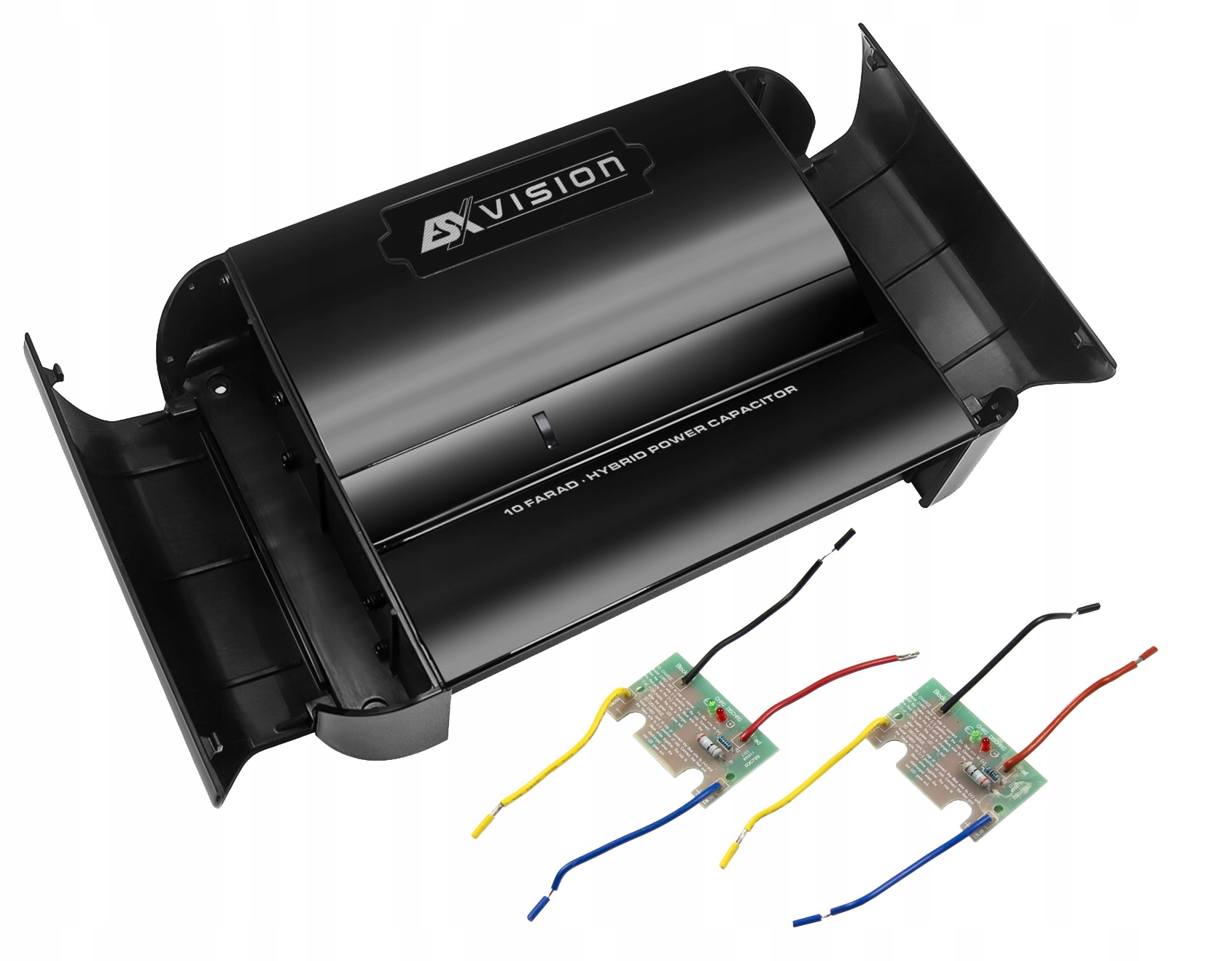 Гибридный конденсатор EXS VISION VX10.0 PRO со встроенным распределительным блоком — идеальная защита источника питания для мощных усилителей высокой мощности серии VX PRO SPL. Благодаря гибридной технологии углеродных и электролитических конденсаторов он обеспечивает гораздо более стабильное питание, значительное улучшение звука и гораздо лучшие характеристики басов для энергоемких усилителей.