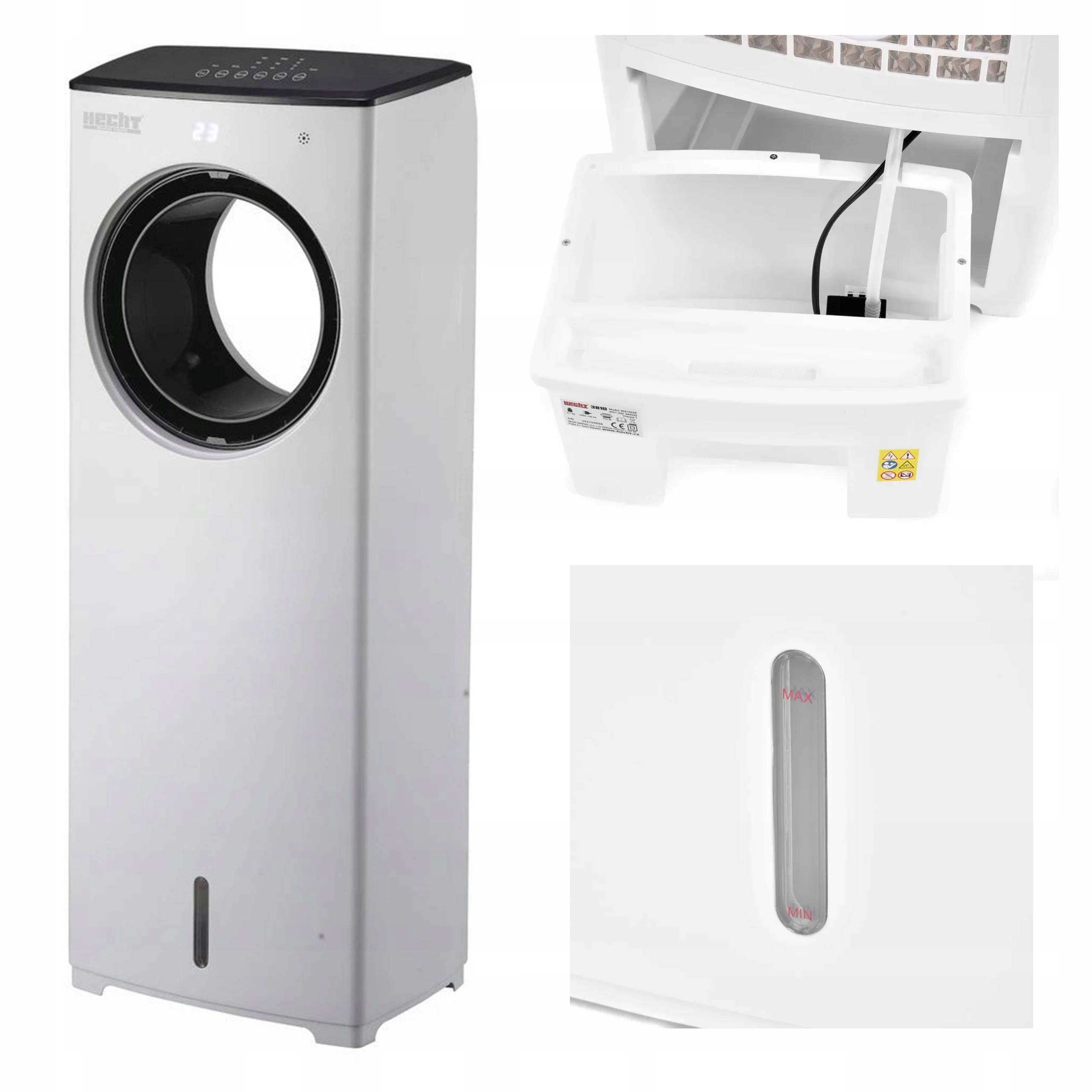 HECHT 3810 впечатляет прежде всего своим современным дизайном. Вентилятор полностью спрятан внутри, а радиатор создает впечатление, что через большое отверстие проходит только воздух без всякого привода. Устройство работает по простому принципу испарения.