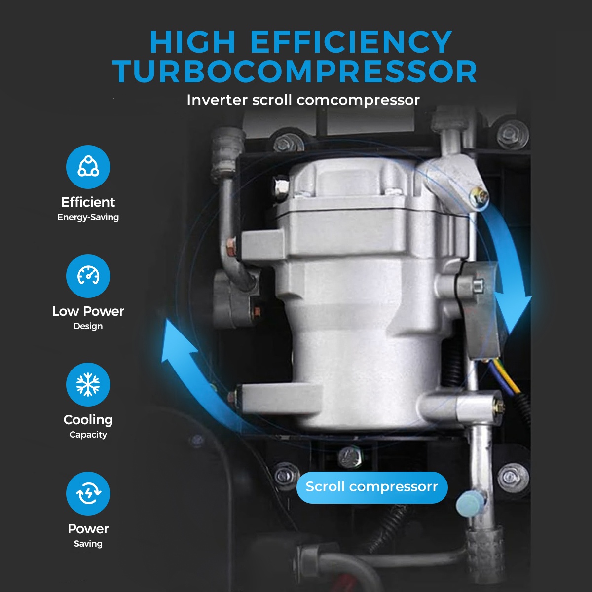 - Благодаря электрическому компрессору Scroll наш кондиционер 12 В потребляет меньше топлива и быстрее охлаждается. Обеспечивает более спокойное вождение и более спокойную обстановку в автомобиле, улучшая комфорт путешествий.
