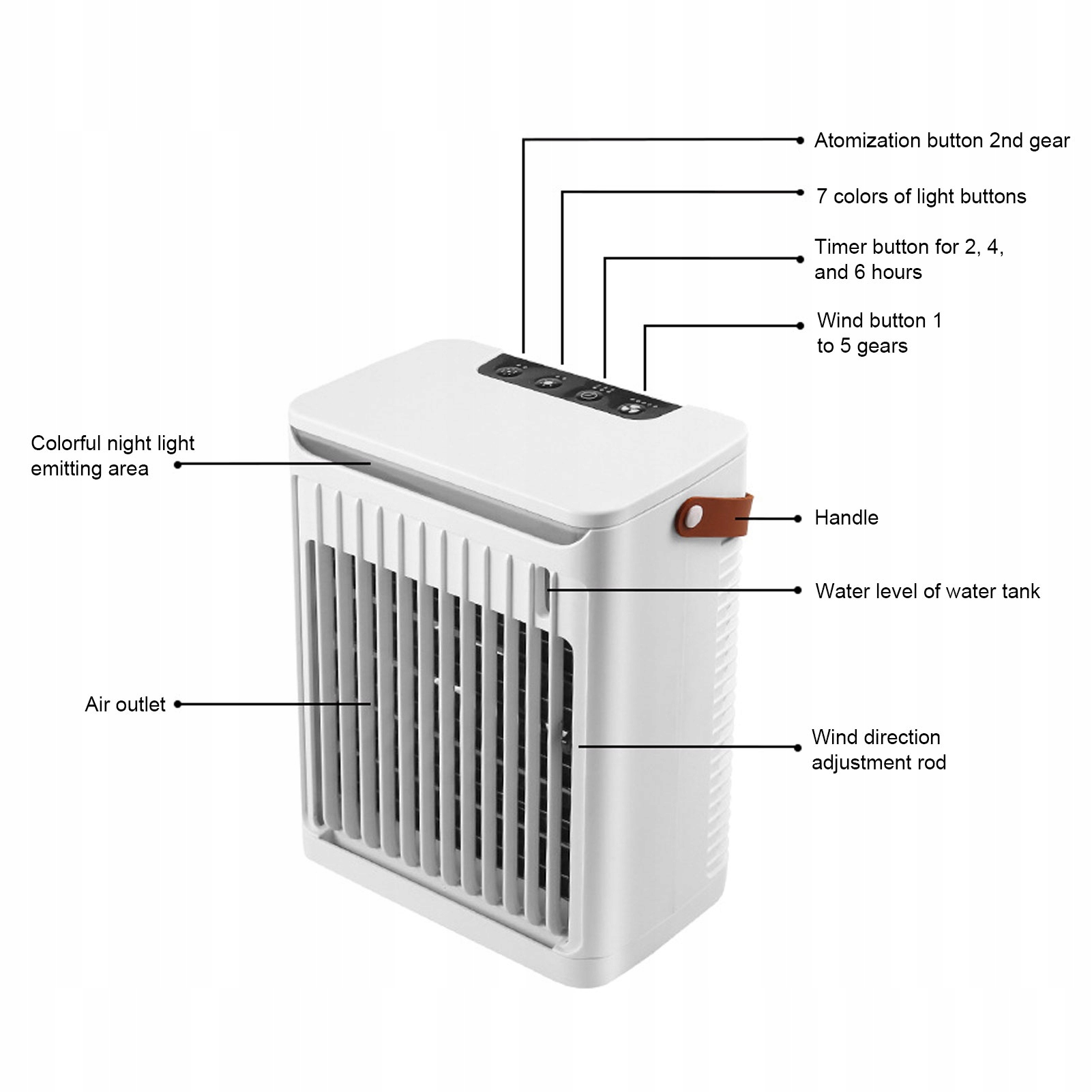 4. 5 скоростей и 2 уровня тумана: наш портативный кондиционер подходит для помещений с 5 скоростями и 2 уровнями тумана, отвечая вашим различным потребностям. Он обеспечивает максимальную скорость ветра 2,8 м/с и максимальную производительность тумана 5 мл/мин. Испарительный воздухоохладитель обеспечивает быстрое охлаждение или мягкое увлажнение при тихой работе, имеет спящий режим и 7-цветную ночную подсветку для лучшей атмосферы и отдыха.