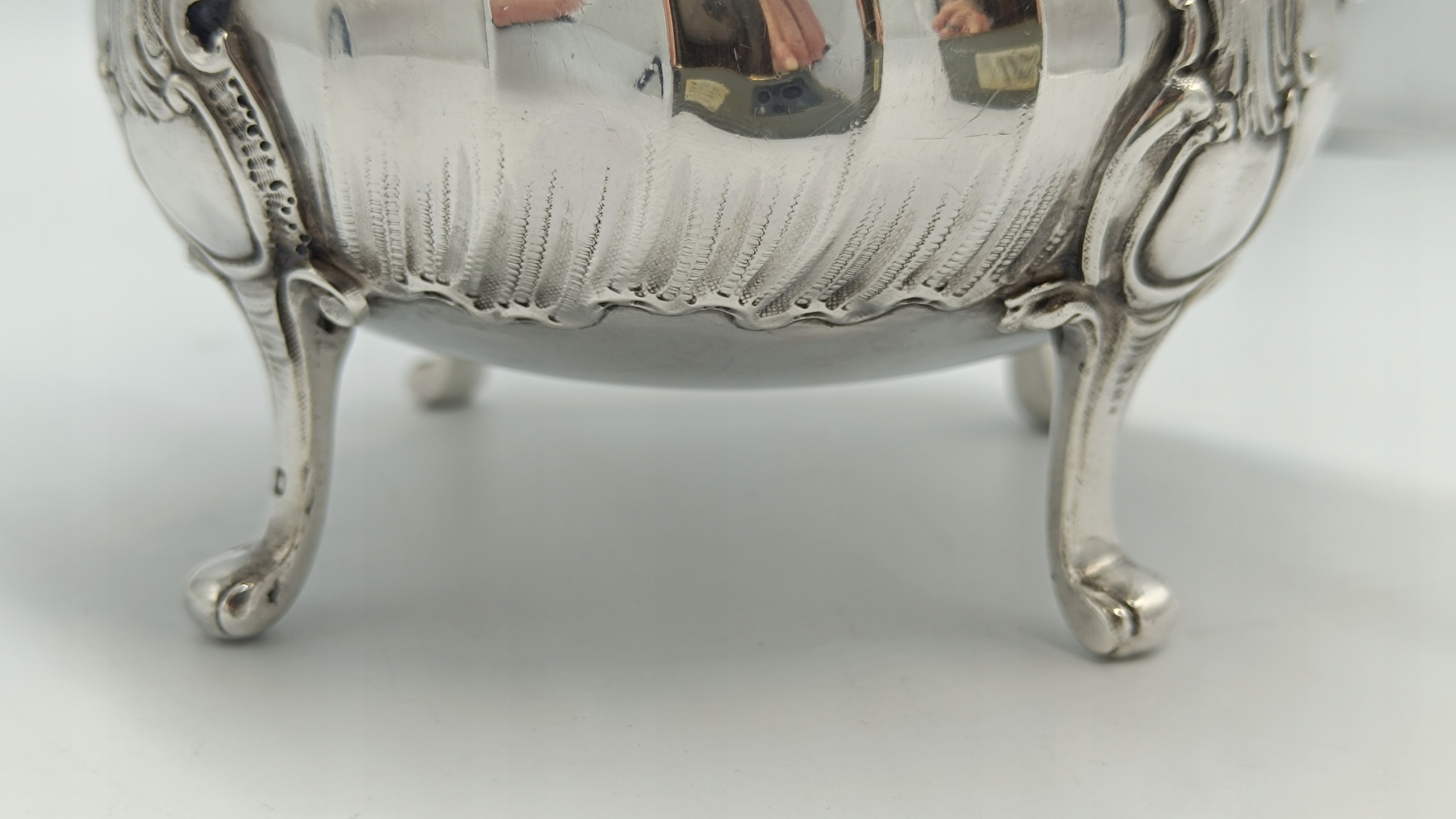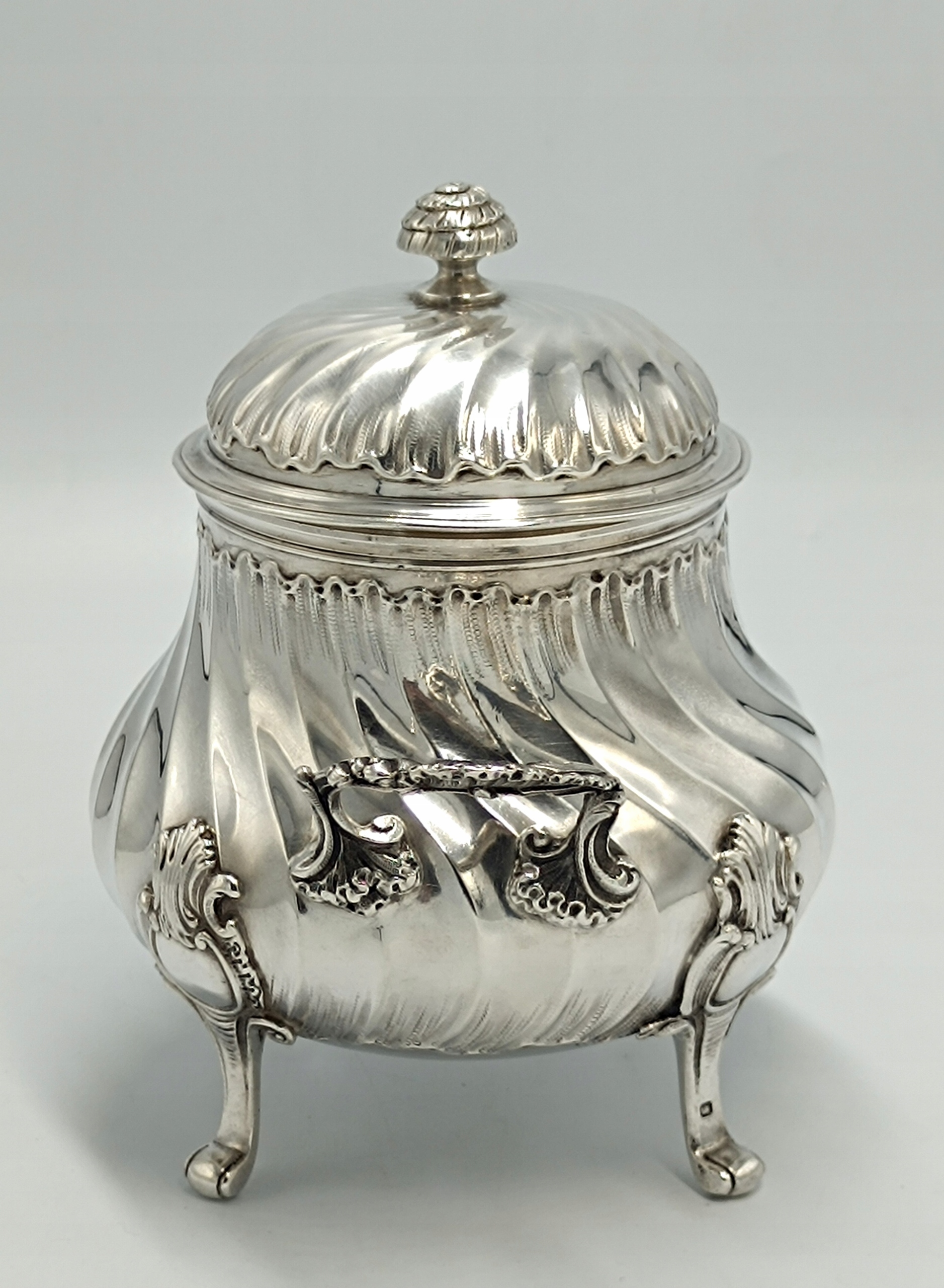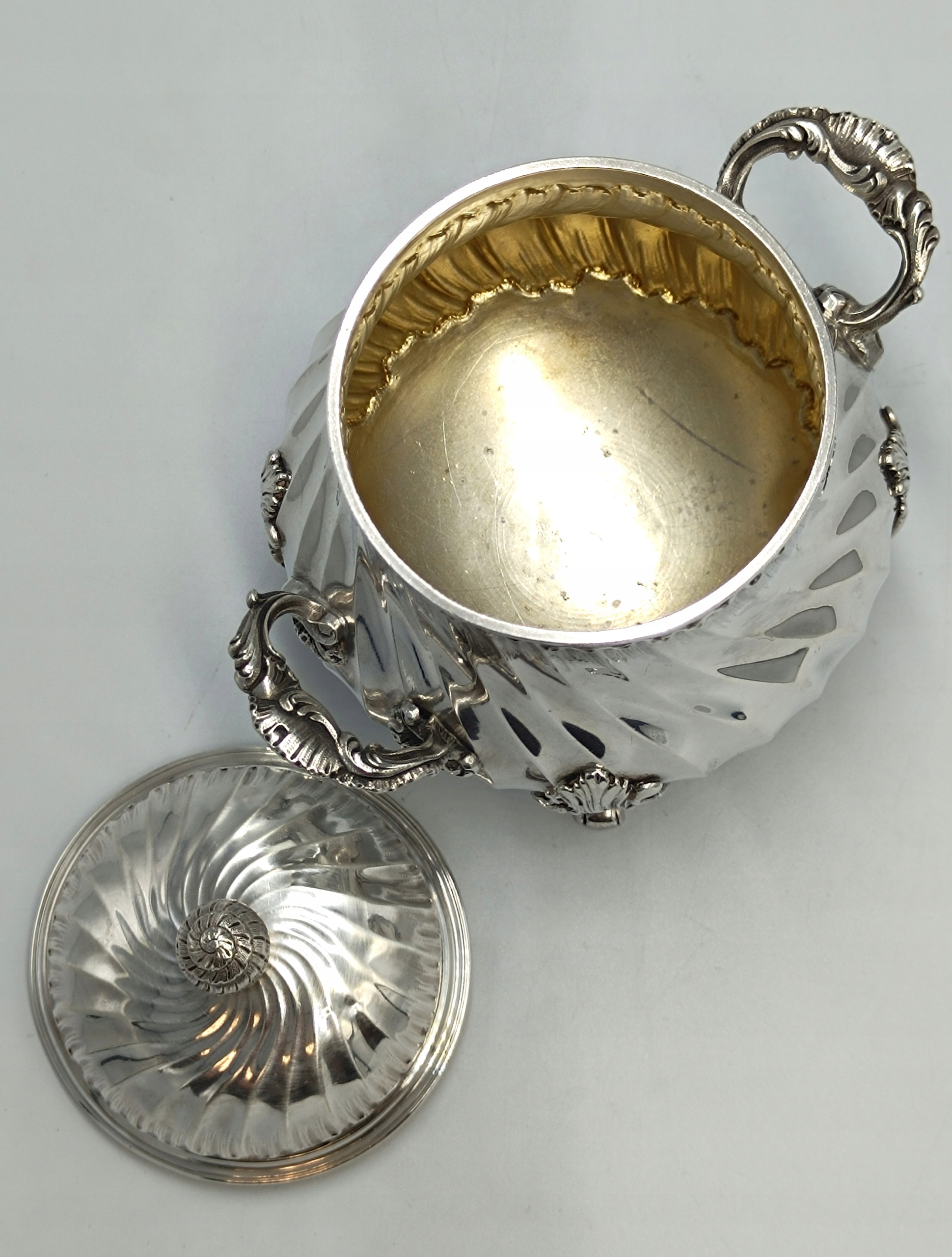 Мы представляем прекрасного кондитерского кондитерского изделия, полностью из 950 серебра, о чем свидетельствует каламбур на стороне крышки, изображающей головку шахты с номером 1 справа- этот знак использовался с 1838 года. Кондитерский состав был сделан во Франции во время отделения (1890R-1910). Характерными особенностями стиля искусства являются жидкие, волнистые линии, абстрактные, растения или украшения для животных, а также асимметрия и богатые, элегантные украшения. Сахарная чаша встроена на 4 коротких ногах, что дает ей невероятную элегантность. Он имеет ручки с обеих сторон >