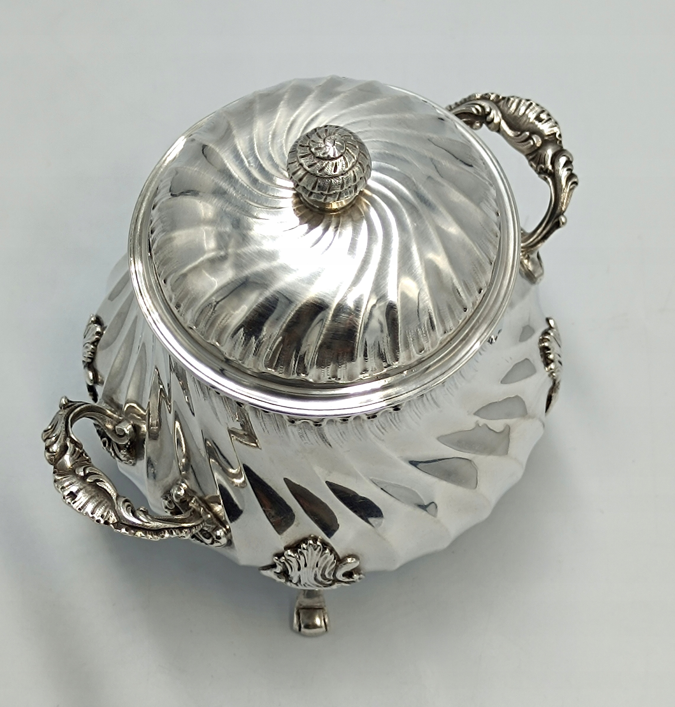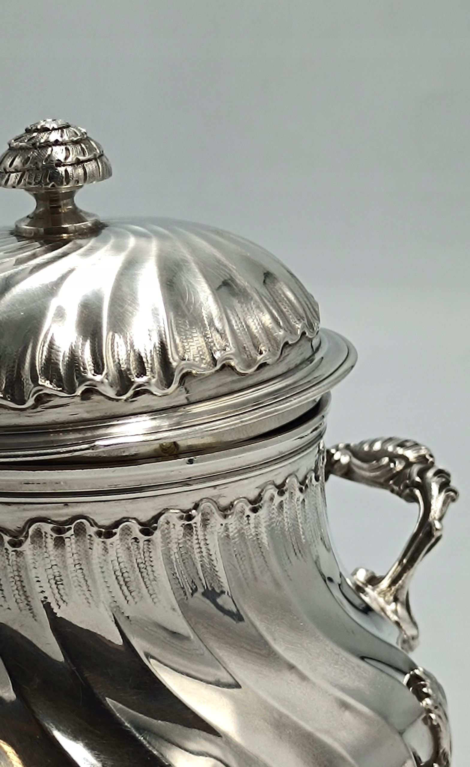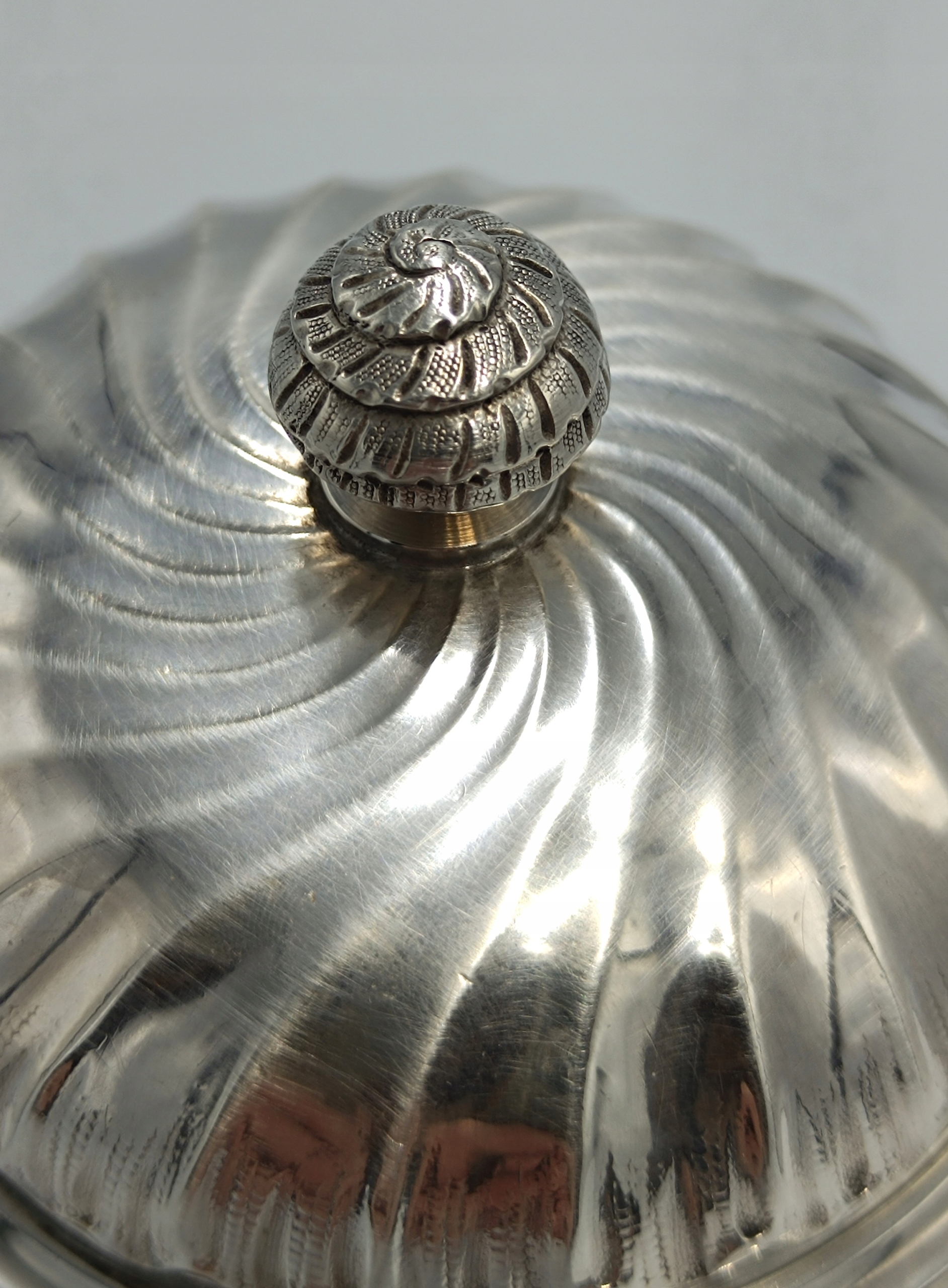 Мы представляем прекрасного кондитерского кондитерского изделия, полностью из 950 серебра, о чем свидетельствует каламбур на стороне крышки, изображающей головку шахты с номером 1 справа- этот знак использовался с 1838 года. Кондитерский состав был сделан во Франции во время отделения (1890R-1910). Характерными особенностями стиля искусства являются жидкие, волнистые линии, абстрактные, растения или украшения для животных, а также асимметрия и богатые, элегантные украшения. Сахарная чаша встроена на 4 коротких ногах, что дает ей невероятную элегантность. Он имеет ручки с обеих сторон >