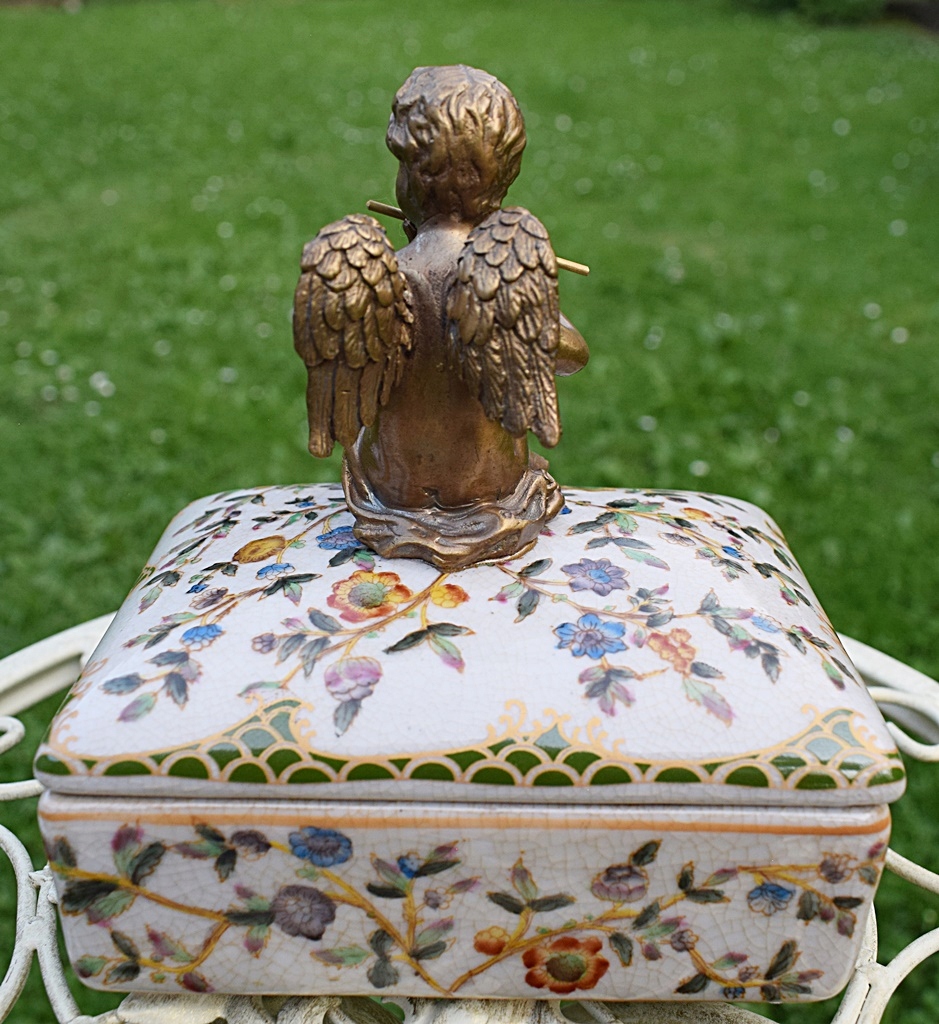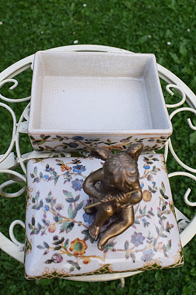 Новая, неиспользованная. Фарфор со вкусом расписан в теплых тонах. Дополнительный декоративный элемент – латунь, создающая оригинальную отделку в форме купидона. Сахарница очаровательная и шикарная, она обязательно станет украшением и полезной вещью в вашем доме.