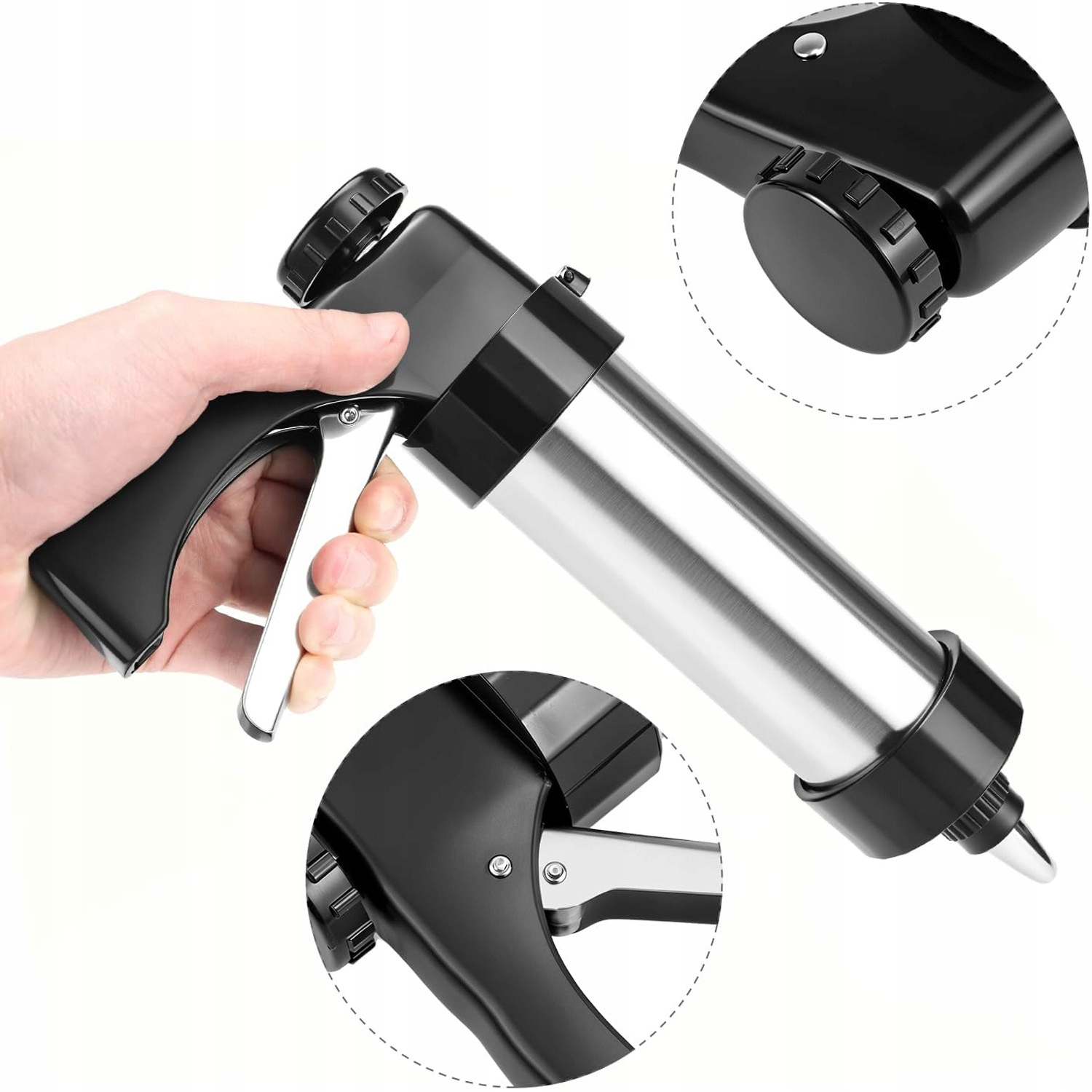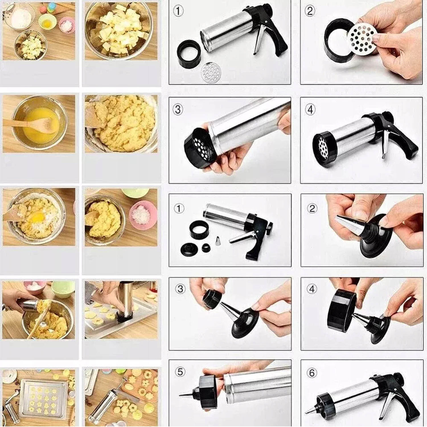 🍪🍩 Простота в использовании: Просто заполните шланг тестом, выберите подходящий диск или насадку и поместите его в машину для печенья, вставьте диск или насадку в крышку и затяните, затем нажмите на ручку. Идеально подходит для новичков.