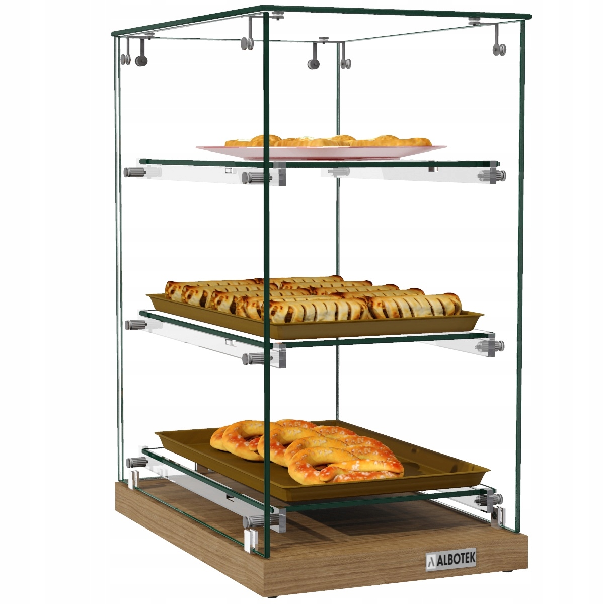 - Полки размещаются на прозрачных опорах из оргстекла, прикрепленных к боковой части пекарской мебели