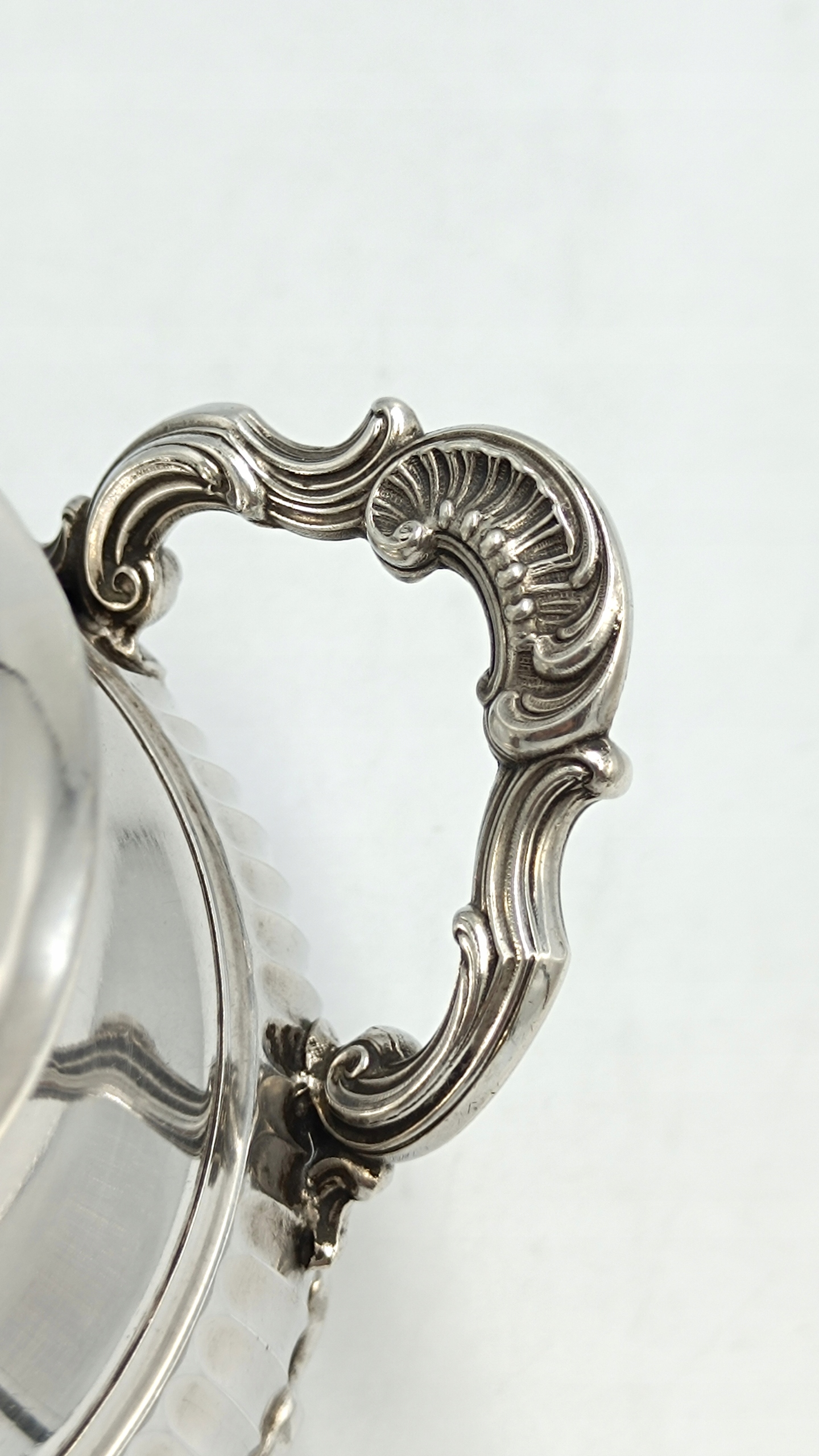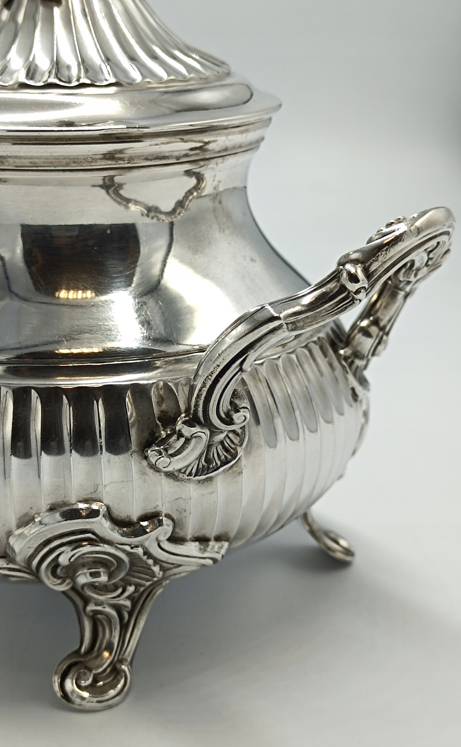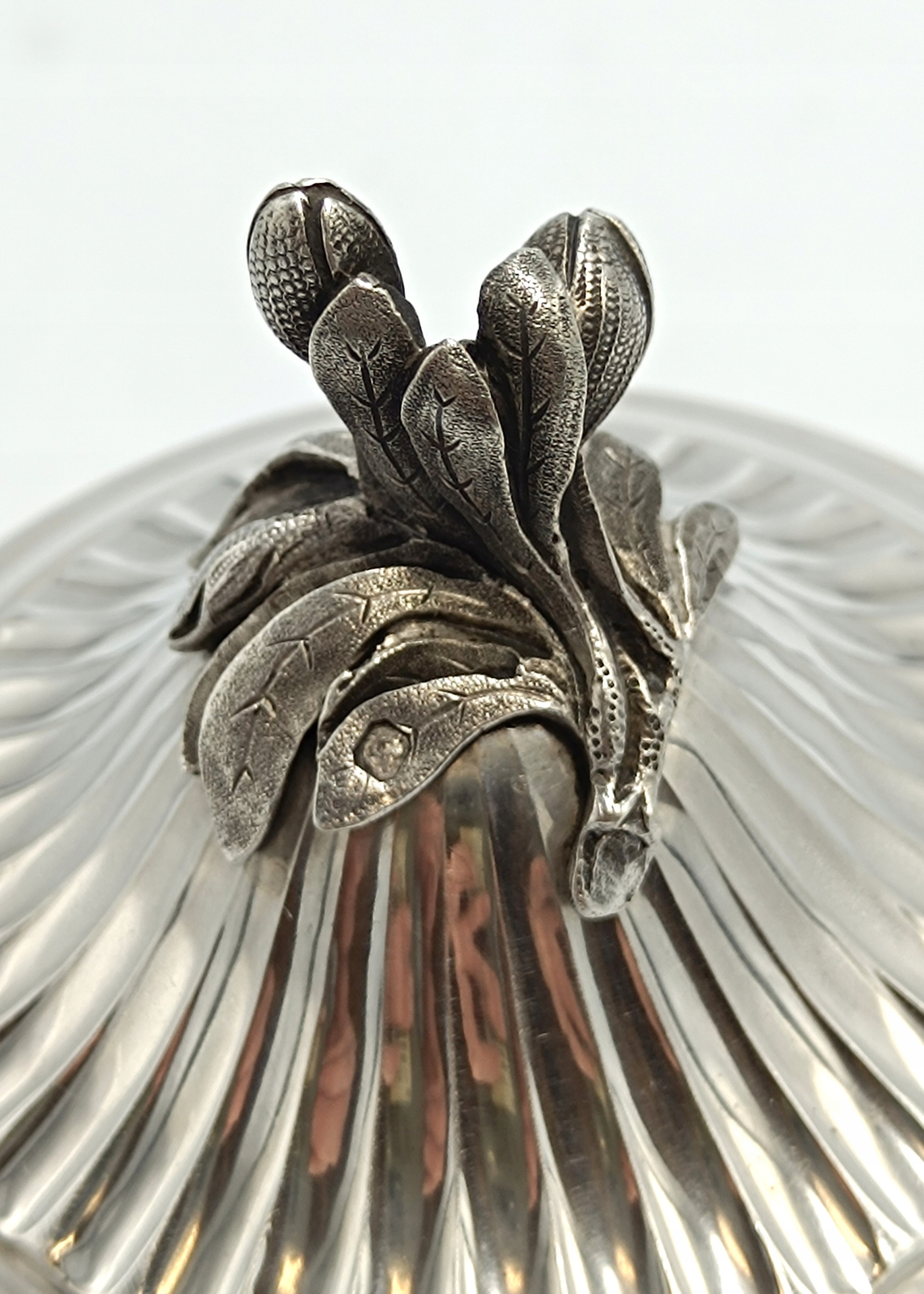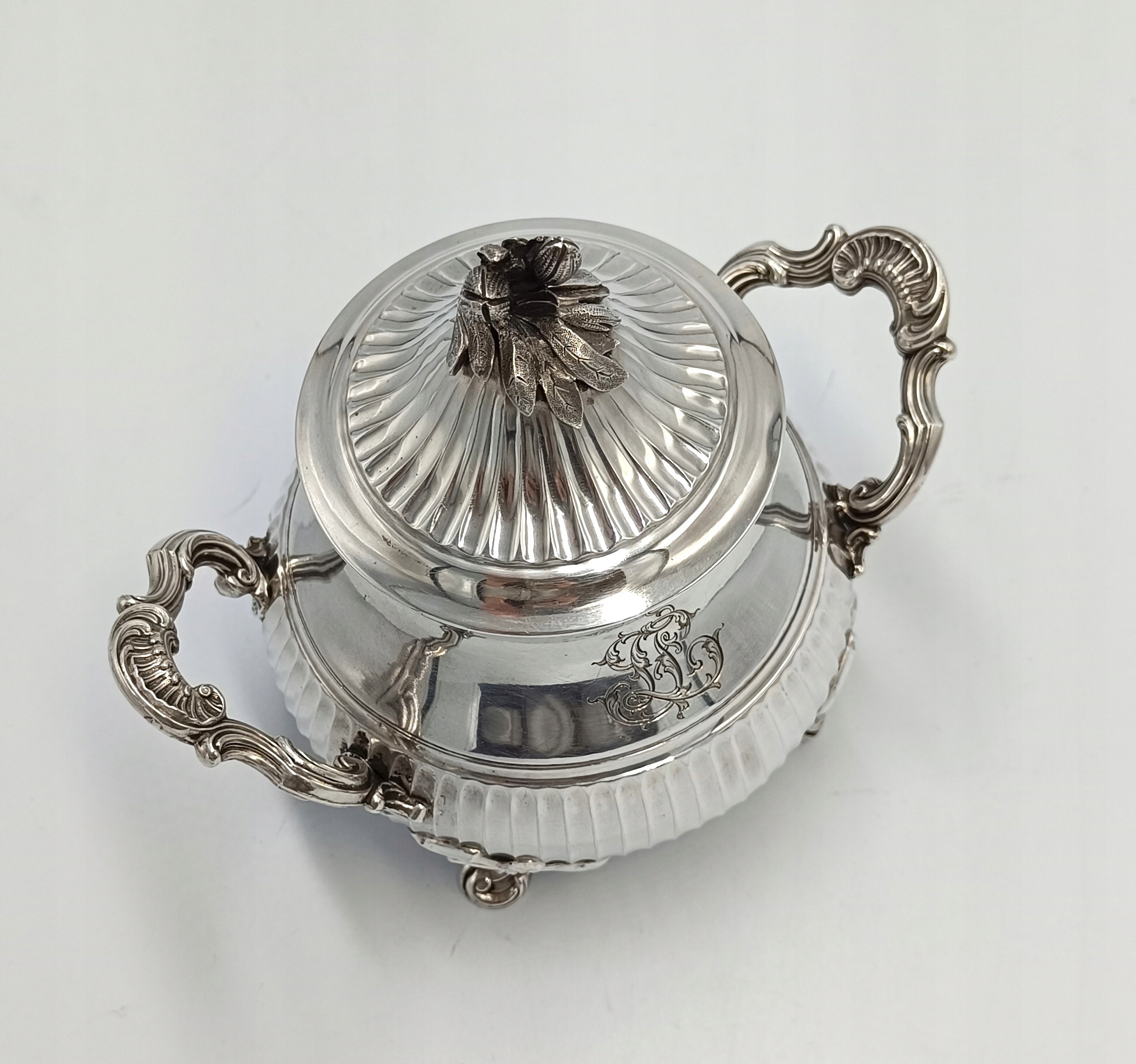 Мы представляем великолепную сахарную чашу, полностью изготовленную из 950 серебра, о чем свидетельствует Пунка на стороне крышки с изображением головы шахты с номером 1 справа.- Этот знак использовался с 1838 года. Кондитерский состав был сделан во Франции во время отделения (1890R-1910). Характерными особенностями стиля искусства являются жидкие, волнистые линии, абстрактные, растения или украшения для животных, а также асимметрия и богатые, элегантные украшения. Сахарная чаша установлена на 4 коротких ногах. У него также есть ручки с обеих сторон. Кульминацией всего является столкновение цветочных бутонов, которое выглядит чрезвычайно элегантным и со вкусом. Стрелка на одной из фотографий). 15,5 см