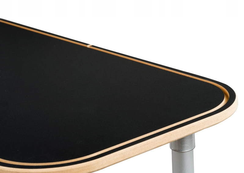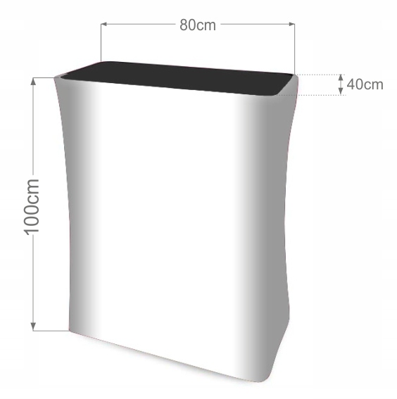 Столешница и основание изготовлены из МДФ и соединены алюминиевыми ножками, образуя каркас подставки, на который натянута ткань, покрытая силиконом. Благодаря использованию ткани в качестве носителя информации прилавок выделяется среди других выставочных систем.