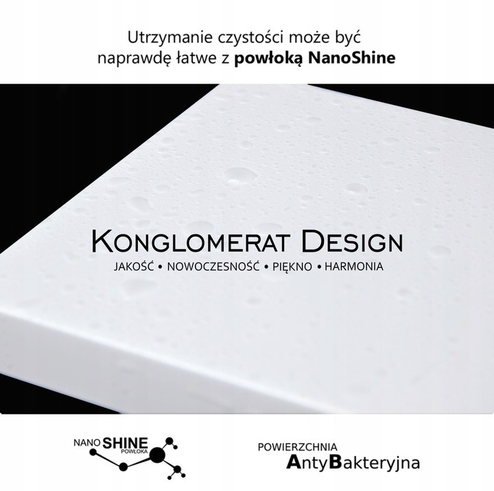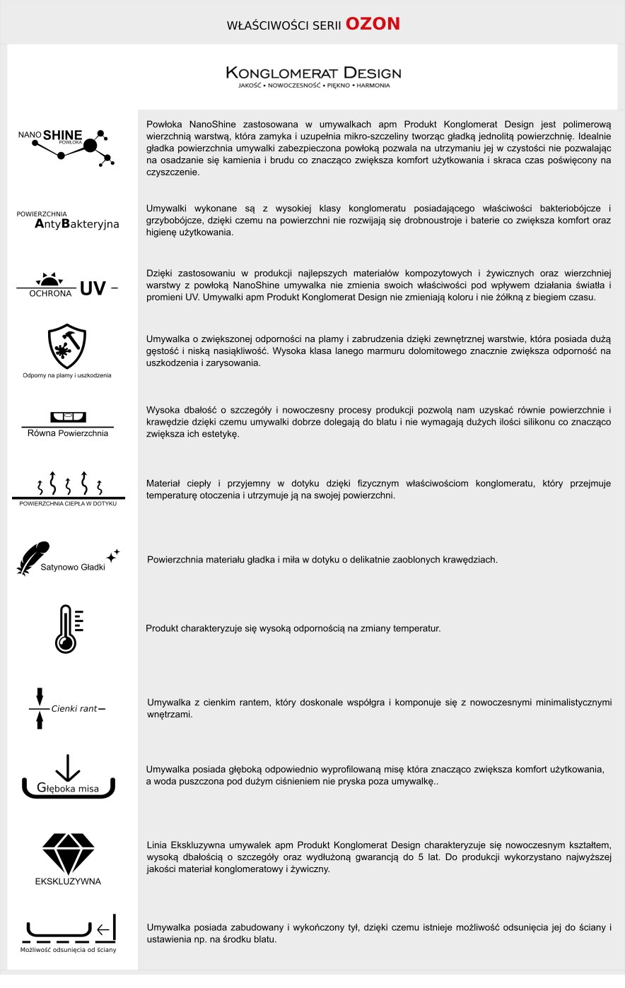 При производстве эксклюзивной линии умывальников APM Product Konglomerat Design использовался конгломерат и смолы высочайшего качества. Раковины очень прочные и устойчивые к царапинам, что делает их идеальными для повседневного использования. Умывальники предназначены для установки на столешницу или шкаф в заранее подготовленное отверстие. Умывальник имеет встроенный глянцевый хромированный перелив, расположенный посередине задней стенки чаши. Отверстие под смеситель диаметром 3,5 см и сифон 4,5 см, стандартизированные для соответствия 99% сифонов и кранов, доступных на польском рынке.