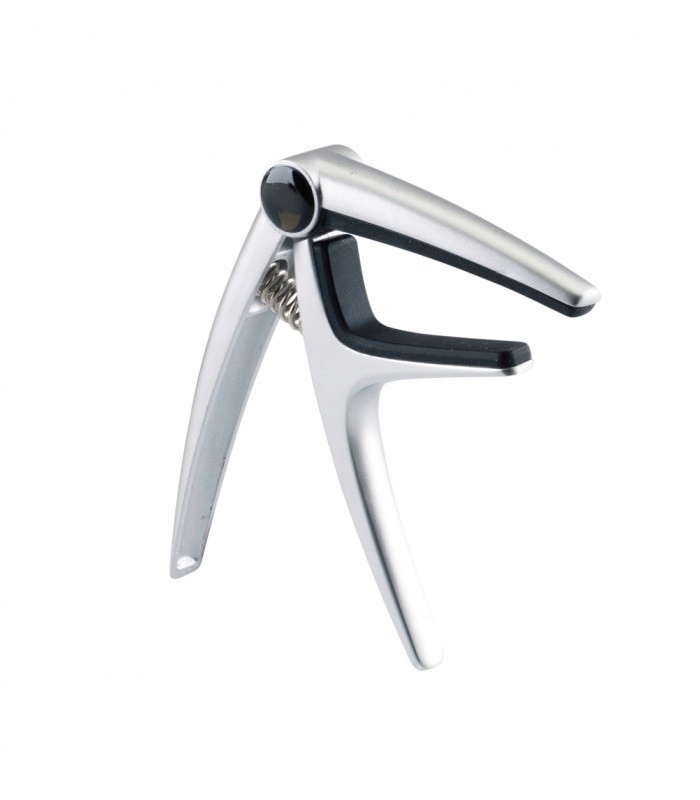 Профессиональный каподастр для электрических и акустических гитар с изогнутой накладкой грифа. Зажимным механизмом можно быстро и легко управлять одной рукой. Легкая алюминиевая конструкция с матовым хромированием. Благодаря резиновой накладке каподастр прочно сидит на накладке грифа и не скользит.
