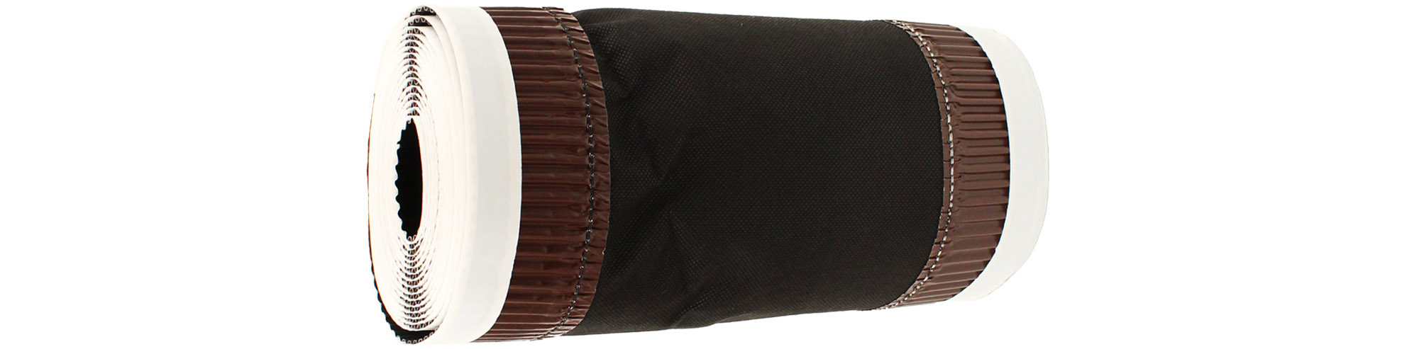 Паропроницаемая коньковая лента в виде двух полос плиссированного алюминия, соединенных вместе с помощью очень прочного геотекстиля, снизу отделанных самоклеящимися полосками из высококачественного бутила.