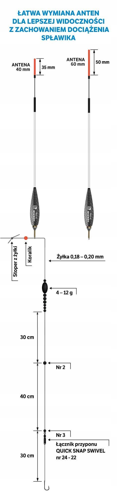 Заменяемая, более длинная антенна в наборе, которая улучшает видимость, не мешая установленной нагрузке. Антенны «на лифте» прекрасно проявляются по проблемам. Возможность регулировки нагрузки на поплавок (съемные кольца).