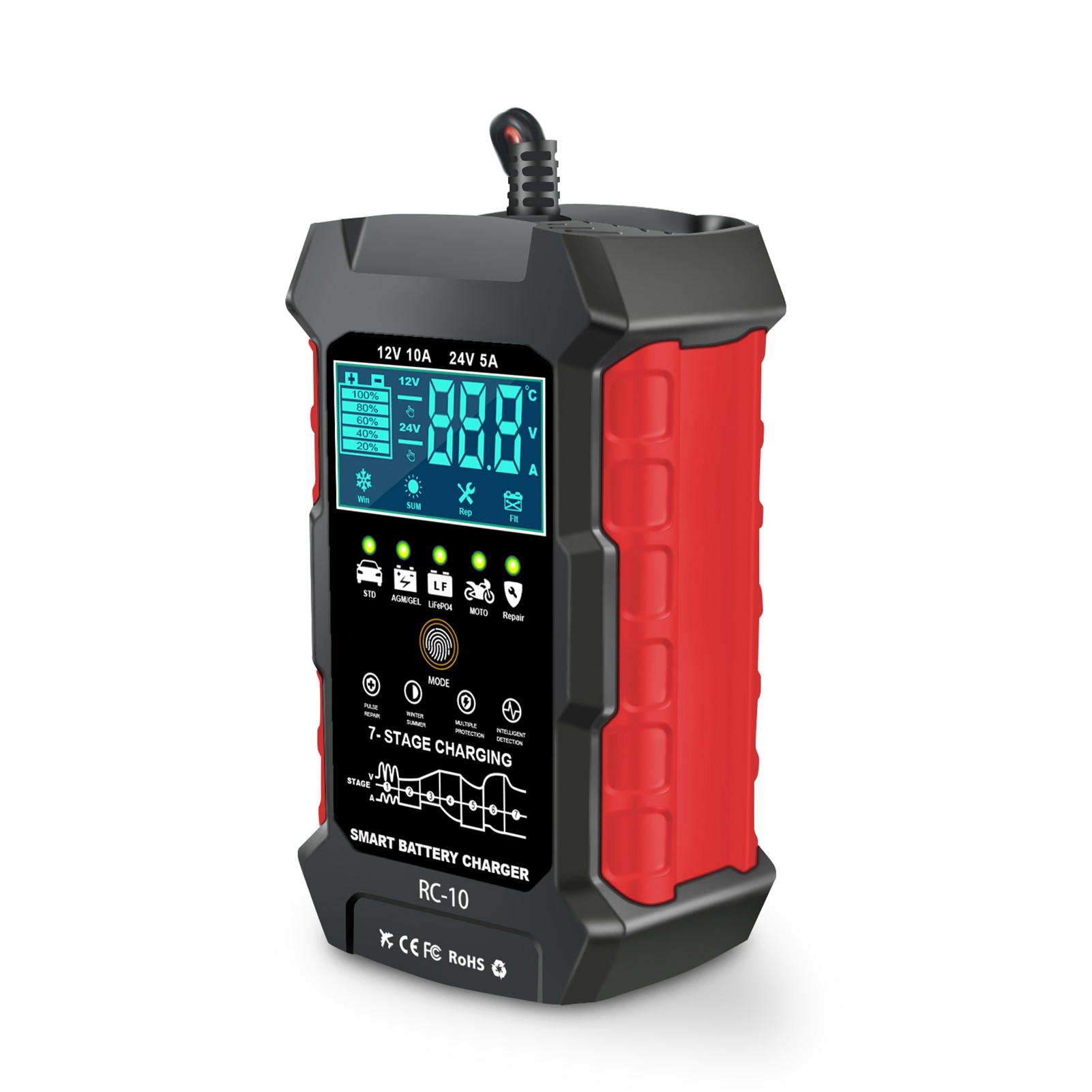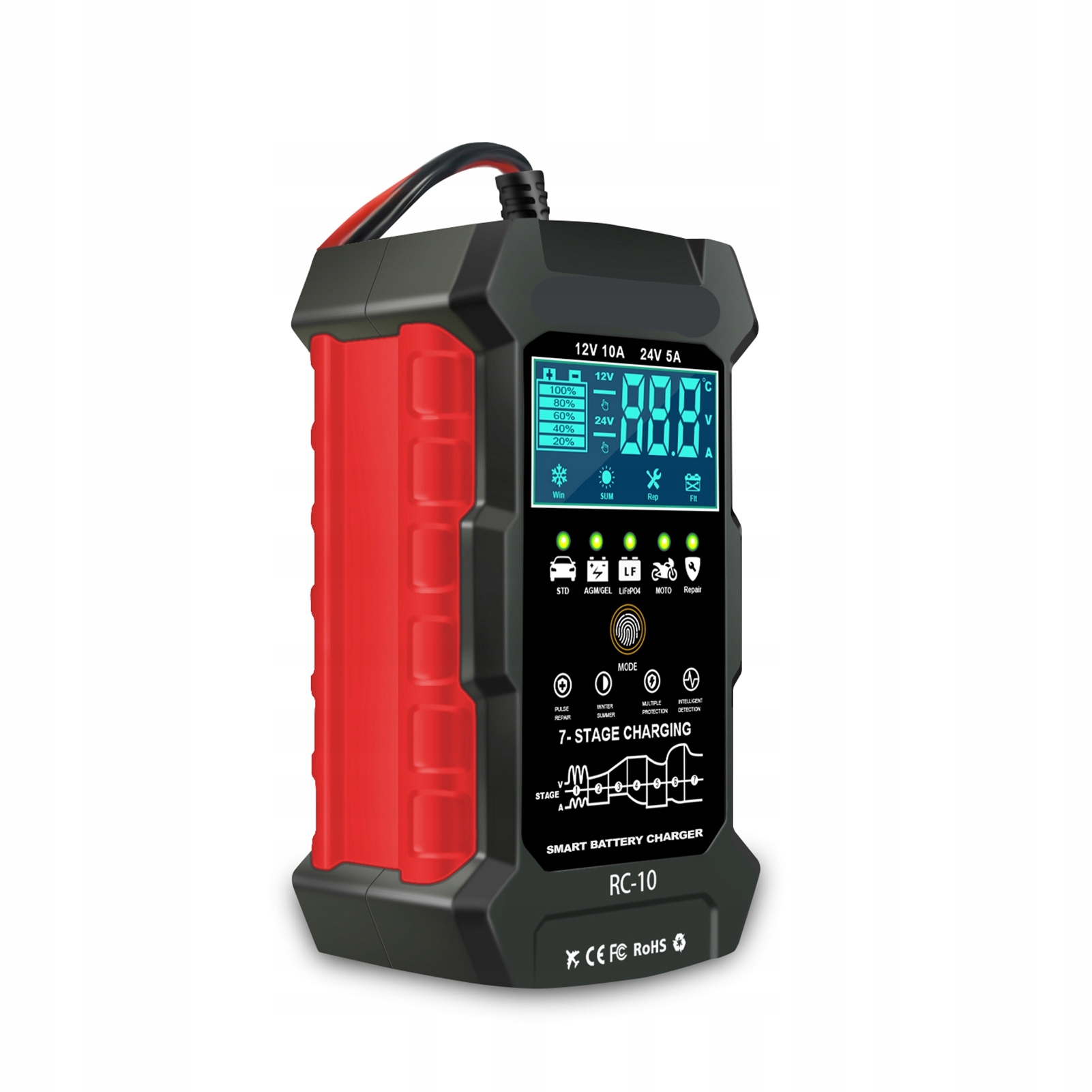 - RC10 Equips имеет расширенные функции зарядки аккумулятора и импульсного ремонта, которые могут заряжать все типы автомобильных, морских и глубоководных аккумуляторов, включая залитые, гелевые, гелевые, литиевые AGM от 4AH до 150AH с 12 В / 24 В, 5 А.