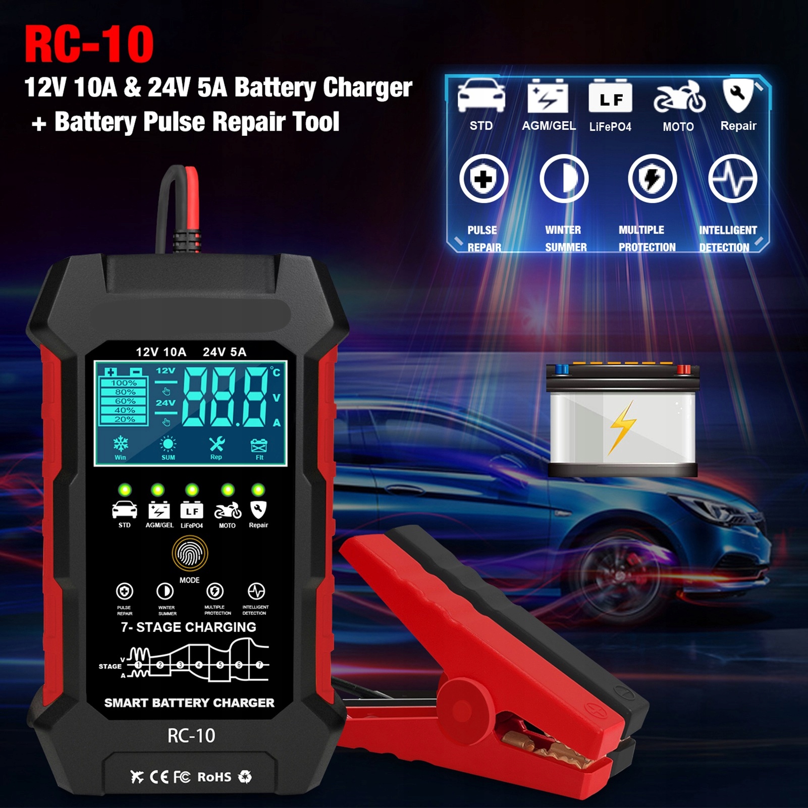 - RC10 Equips имеет расширенные функции зарядки аккумулятора и импульсного ремонта, которые могут заряжать все типы автомобильных, морских и глубоководных аккумуляторов, включая залитые, гелевые, гелевые, литиевые AGM от 4AH до 150AH с 12 В / 24 В, 5 А.
