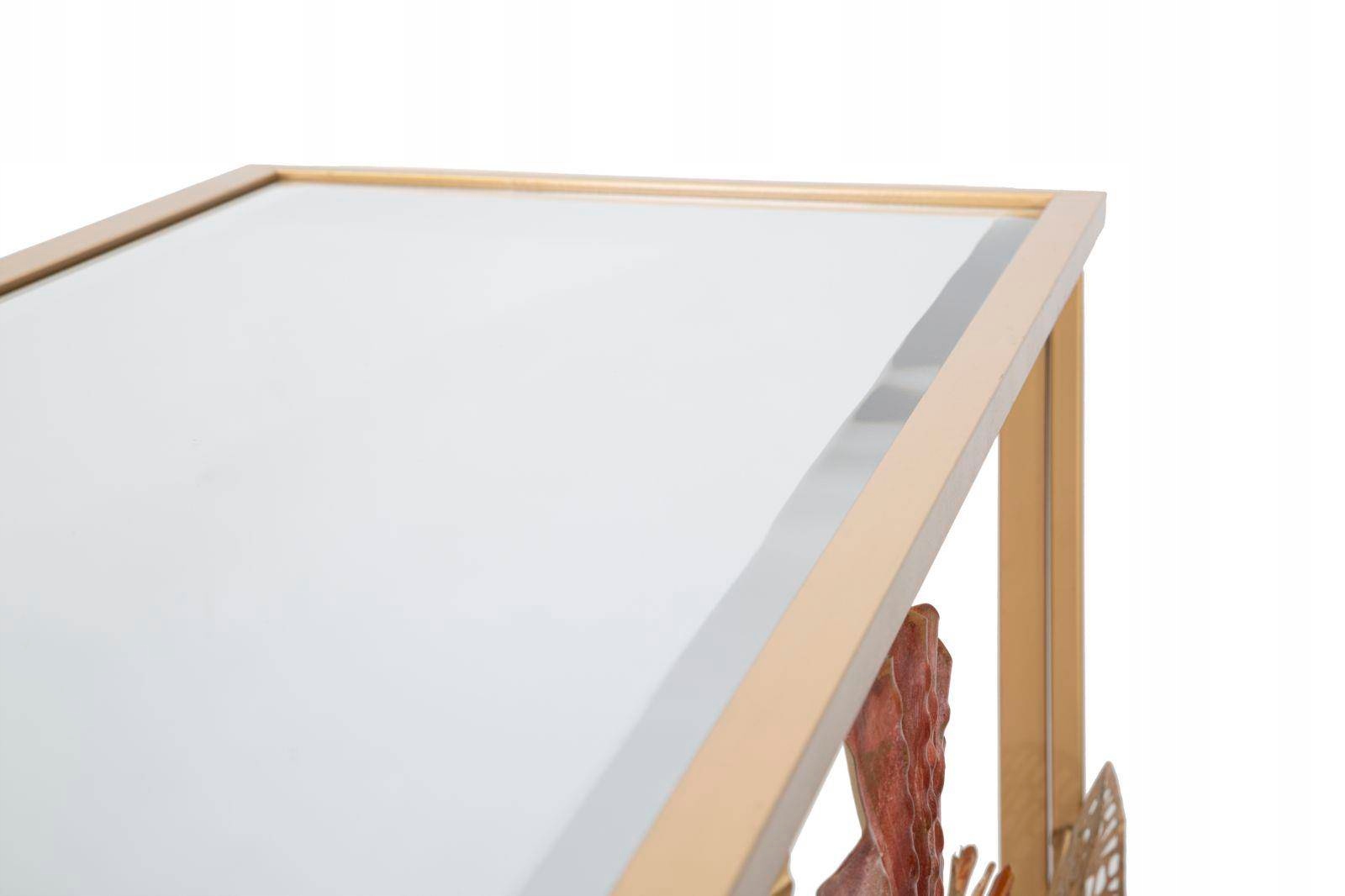Золотая металлическая консоль со столешницей из зеркального стекла. Сооружение украшено со всех сторон разноцветными листьями и цветами. Уникальный дизайн и простота конструктивных линий придадут любому помещению класс и элегантность.