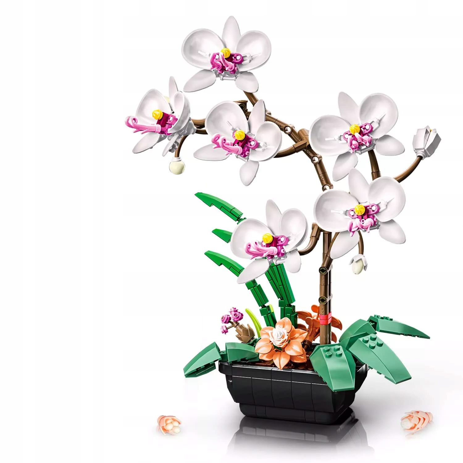В этот набор строительных блоков для орхидей входит специально разработанный элегантный цветочный горшок, поэтому вам не придется искать подходящую вазу для вашей цветочной композиции. Углы стебля, цветов, корней и листьев орхидеи можно свободно регулировать. Эти возможности настройки будут стимулировать ваше воображение. Переставляйте лепестки и листья, чтобы создать свой любимый цветочный узор, или меняйте форму стебля, чтобы создавать совершенно новые формы цветов.