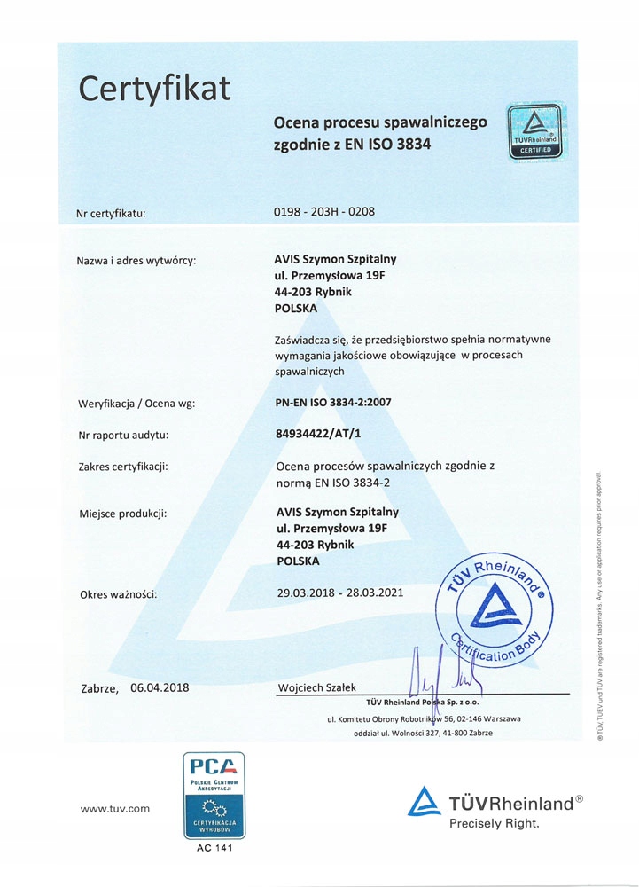 Повышая качество предлагаемой продукции, компания AVIS успешно прошла процедуру сертификации по стандарту PN-EN 1090, который устанавливает стандарты в области производства, в том числе. стальные конструкции. Сертификацию в этой области провел лидер рынка сертификационных и исследовательских услуг в Польше – TÜV Rheinland.