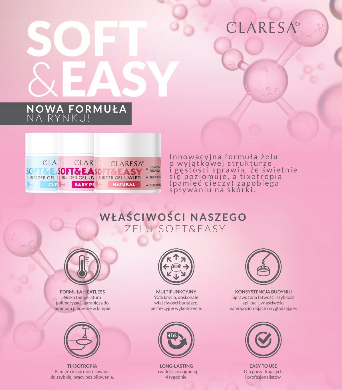 Инновационная формула геля с уникальной структурой и плотностью делает его отличным, что позволяет прощать ошибки даже не очень опытному пользователю, быстро работать этому также способствует тиксотропия, препятствующая его затеканию на кутикулу (жидкая память). Укладка с помощью SOFT&EASY не требует опиливания или топового покрытия — просто протрите дисперсионный слой очистителем и интенсивные блестящие ногти готовы!
