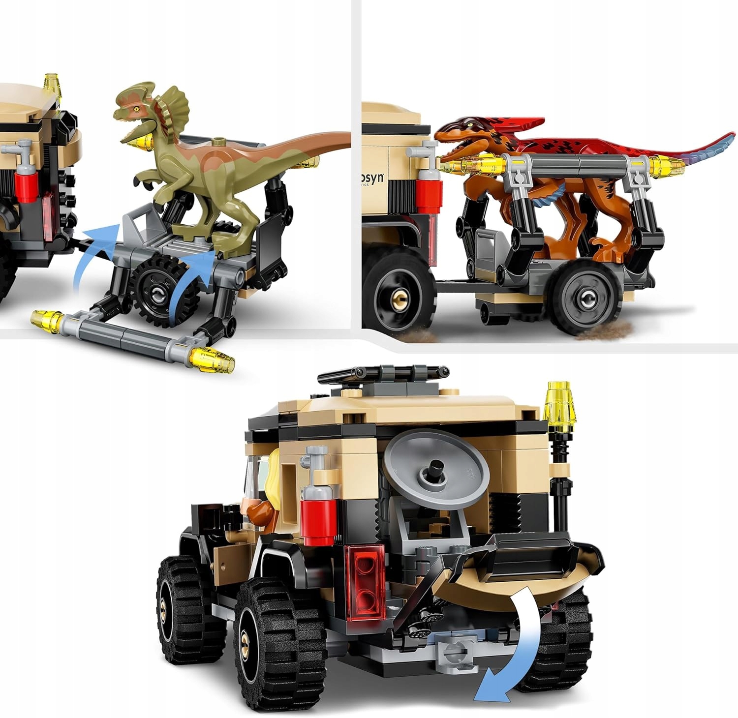 - Игровые функции включают в себя внедорожник с местом для двух минифигурок, съемный локатор динозавра и съемный прицеп с открывающейся клеткой для фигурки динозавра.