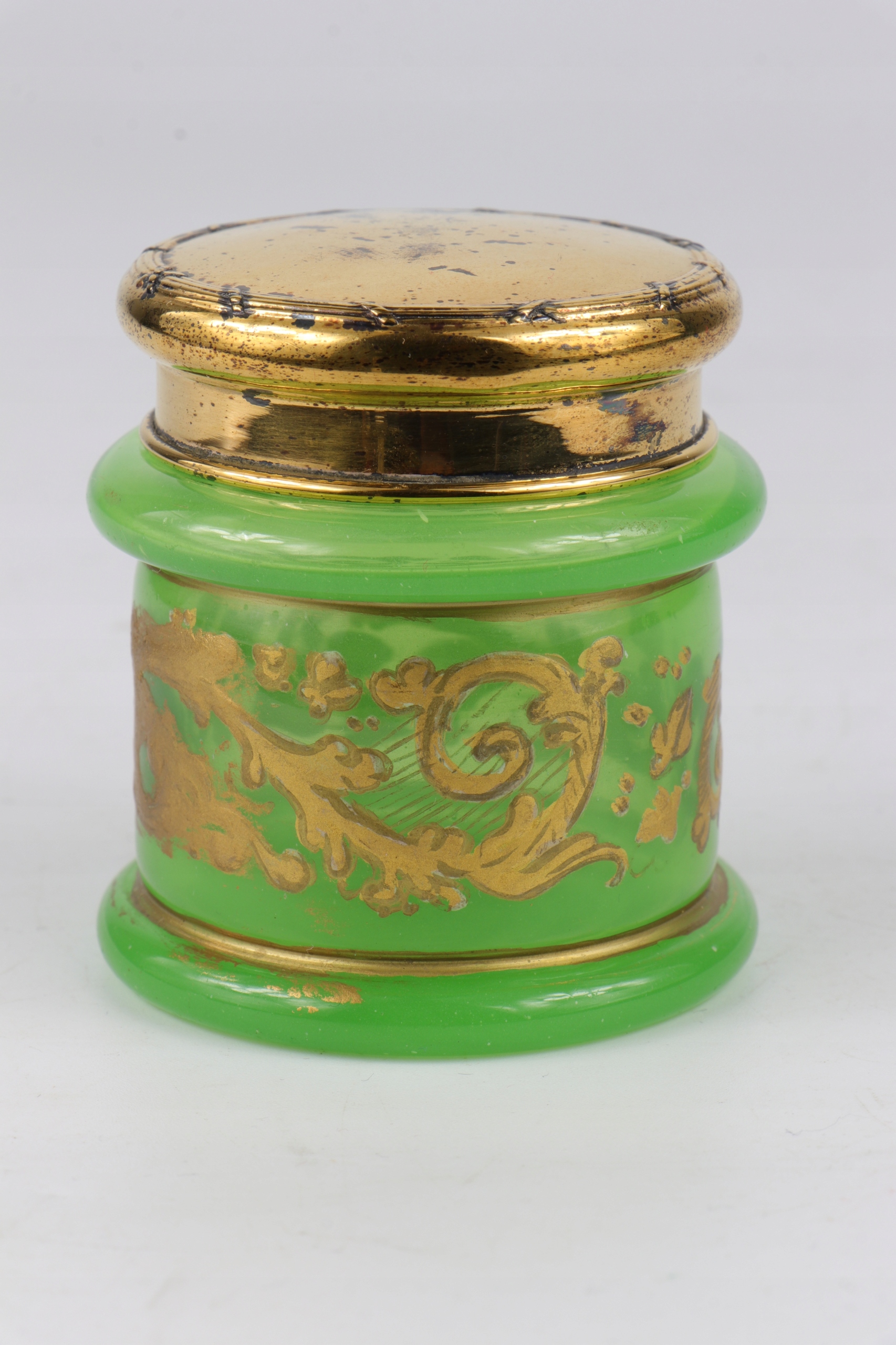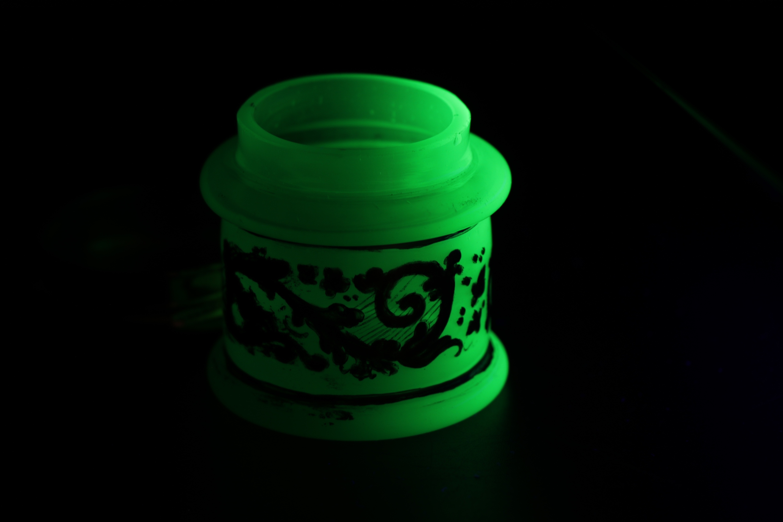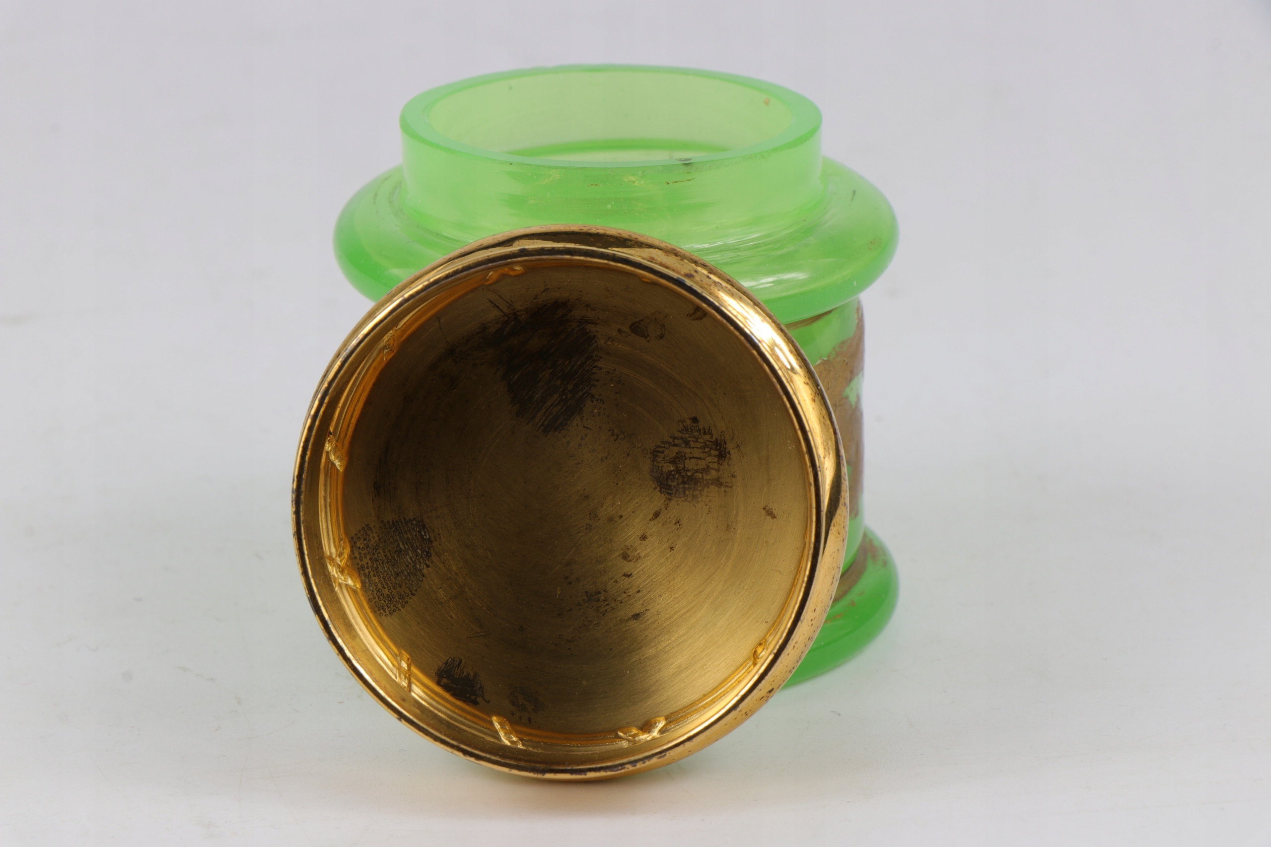 Plejerko Container с крышкой из уранового стекла в характерном зеленом цвете. Густое массивное стекло, украшенное золотистым густым орнаментом. Вторые и последние фотографии в UV Light