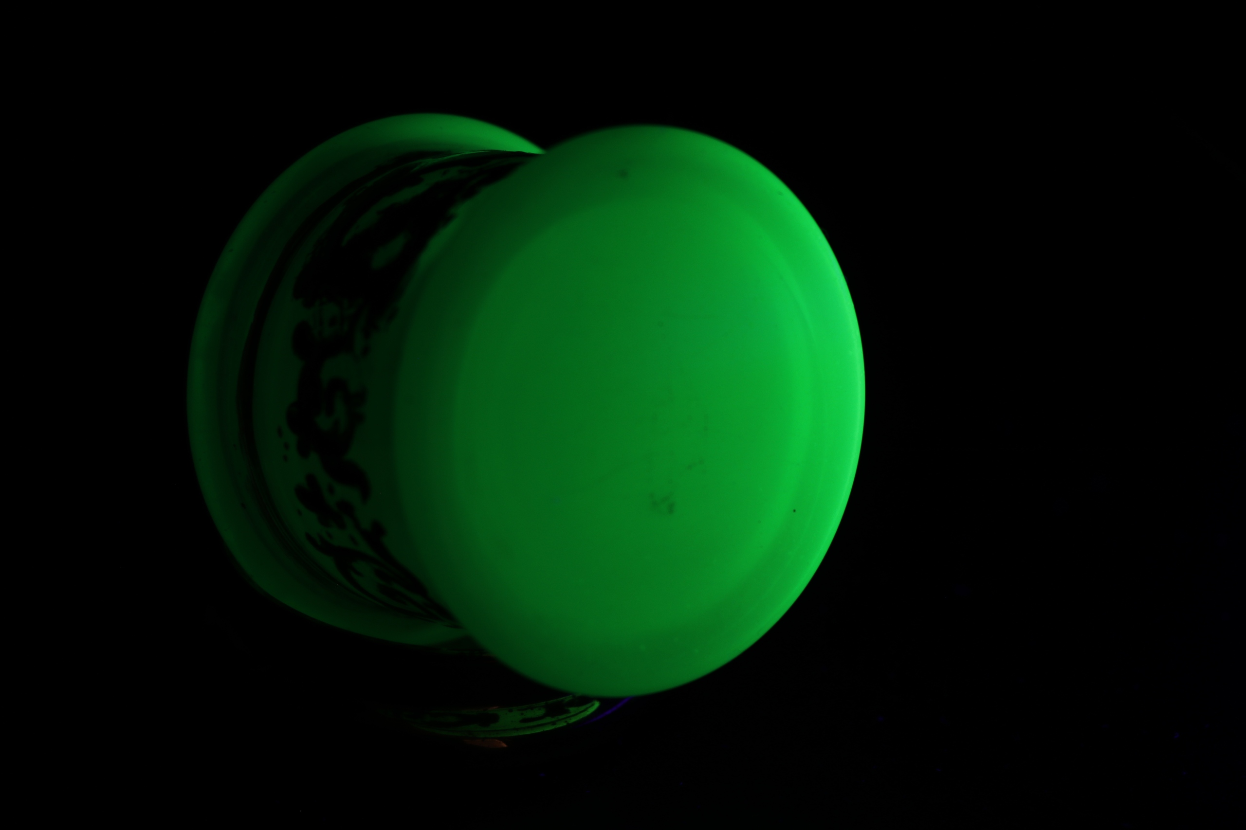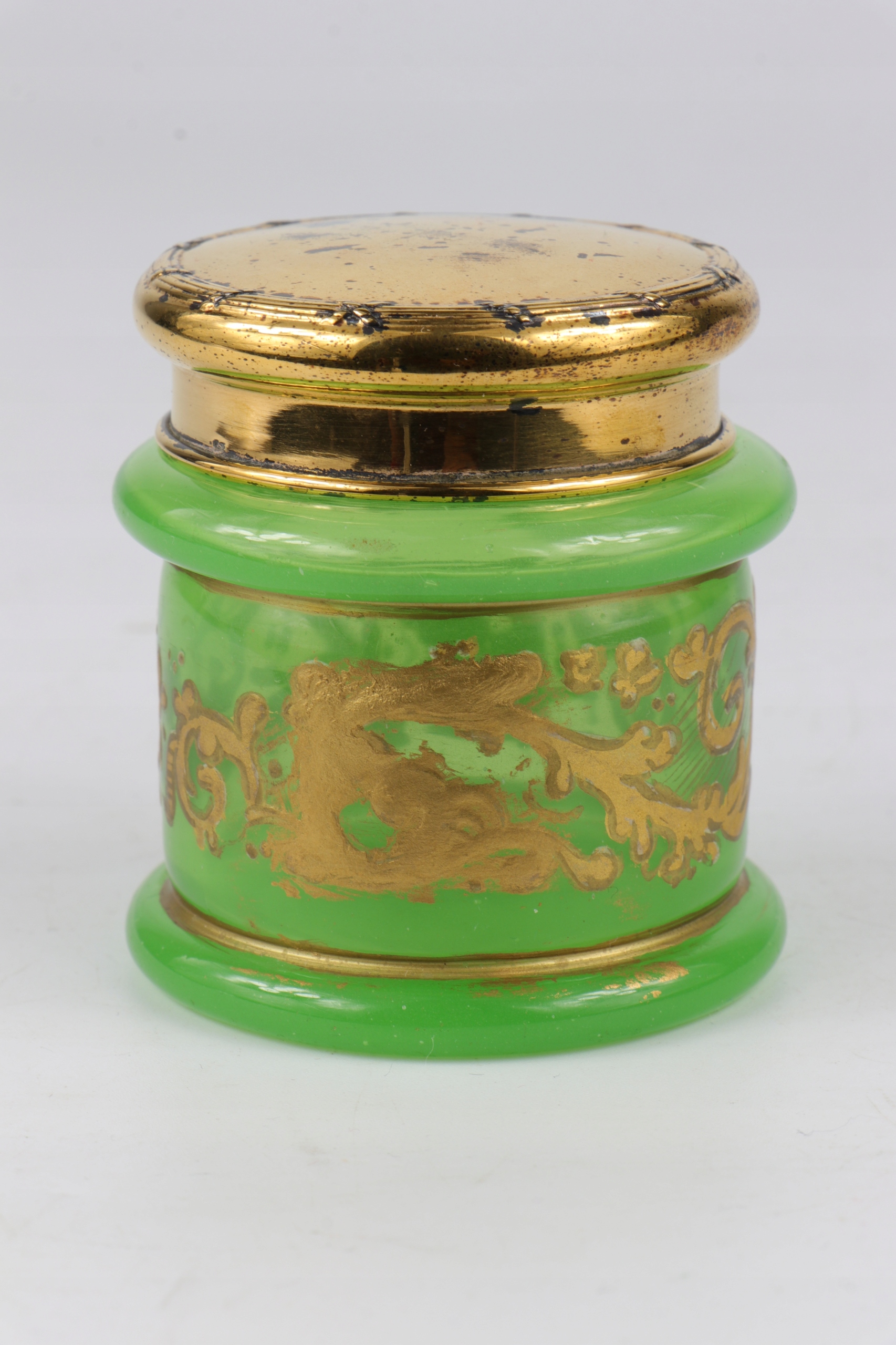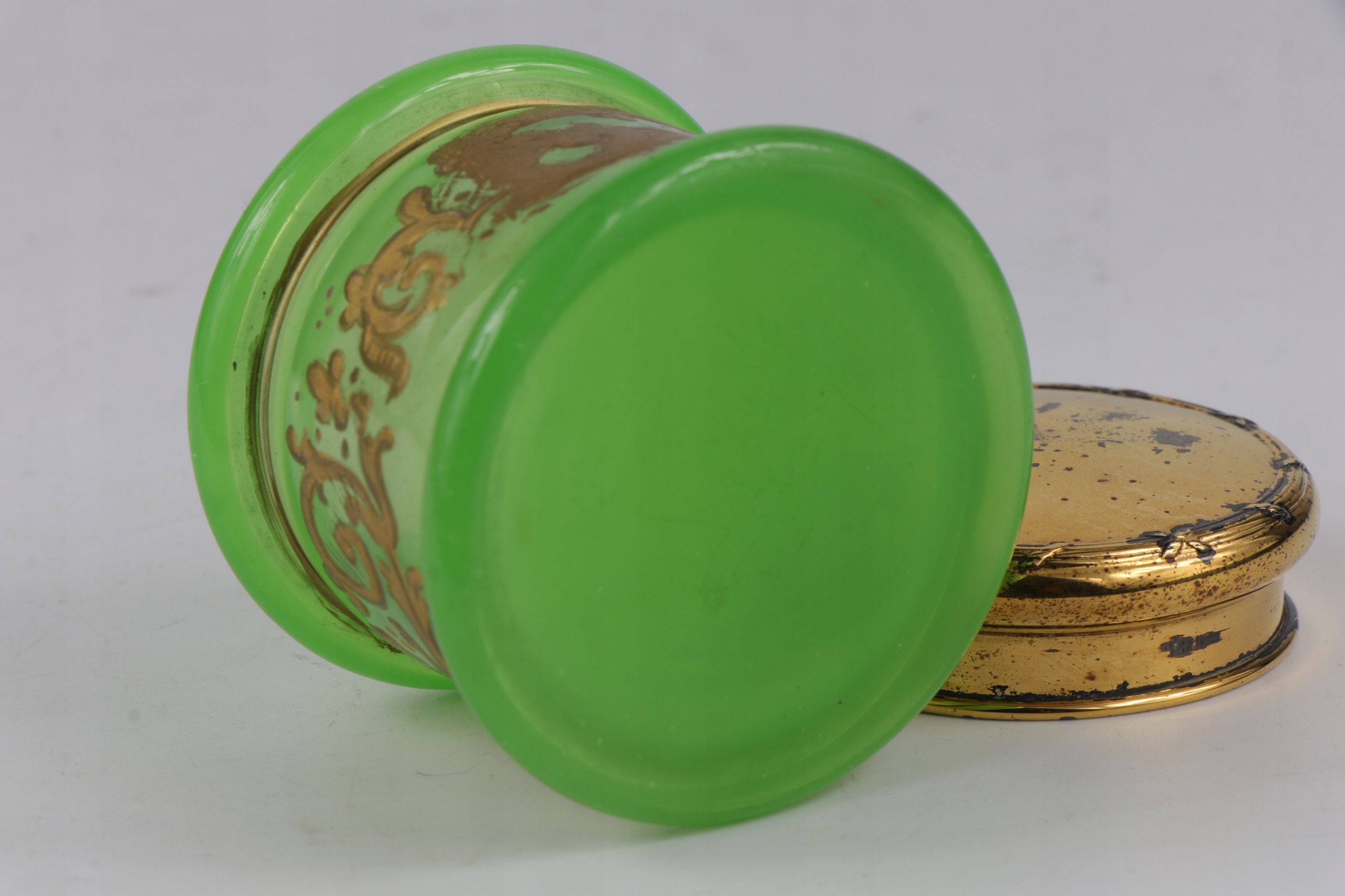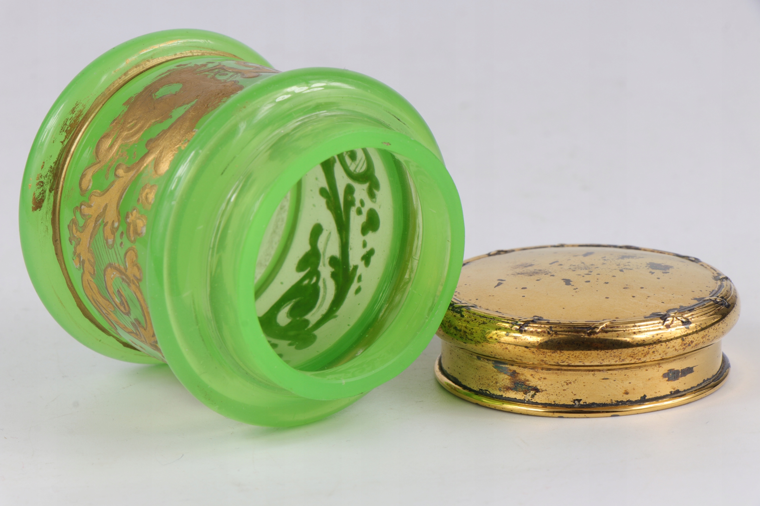 Plejerko Container с крышкой из уранового стекла в характерном зеленом цвете. Густое массивное стекло, украшенное золотистым густым орнаментом. Вторые и последние фотографии в UV Light