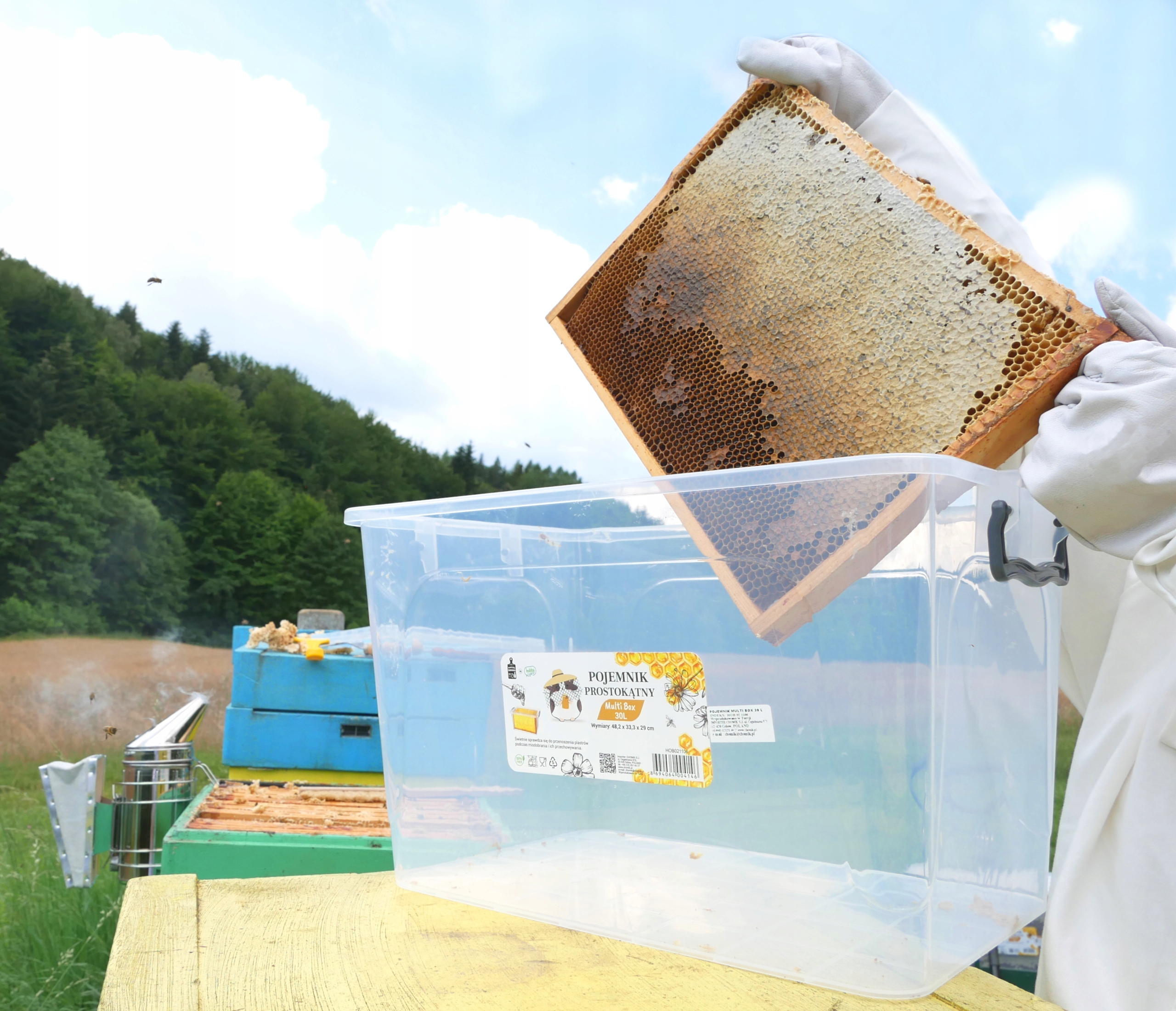 Контейнер оснащен 2 боковыми ручками, которые облегчают перенос рамок из ульев в цех (закручивание меда) во время сбора меда. Прозрачная поверхность делает содержимое контейнера всегда видимым. Контейнер вмещает до 8 кадров. Также предназначен для хранения рамок в зимний период. Плотная крышка предотвратит попадание в рамки сосальщиков и даже грызунов.