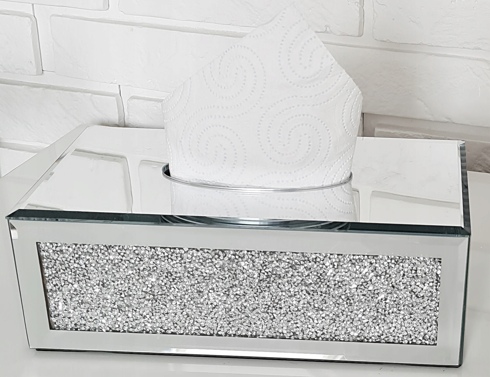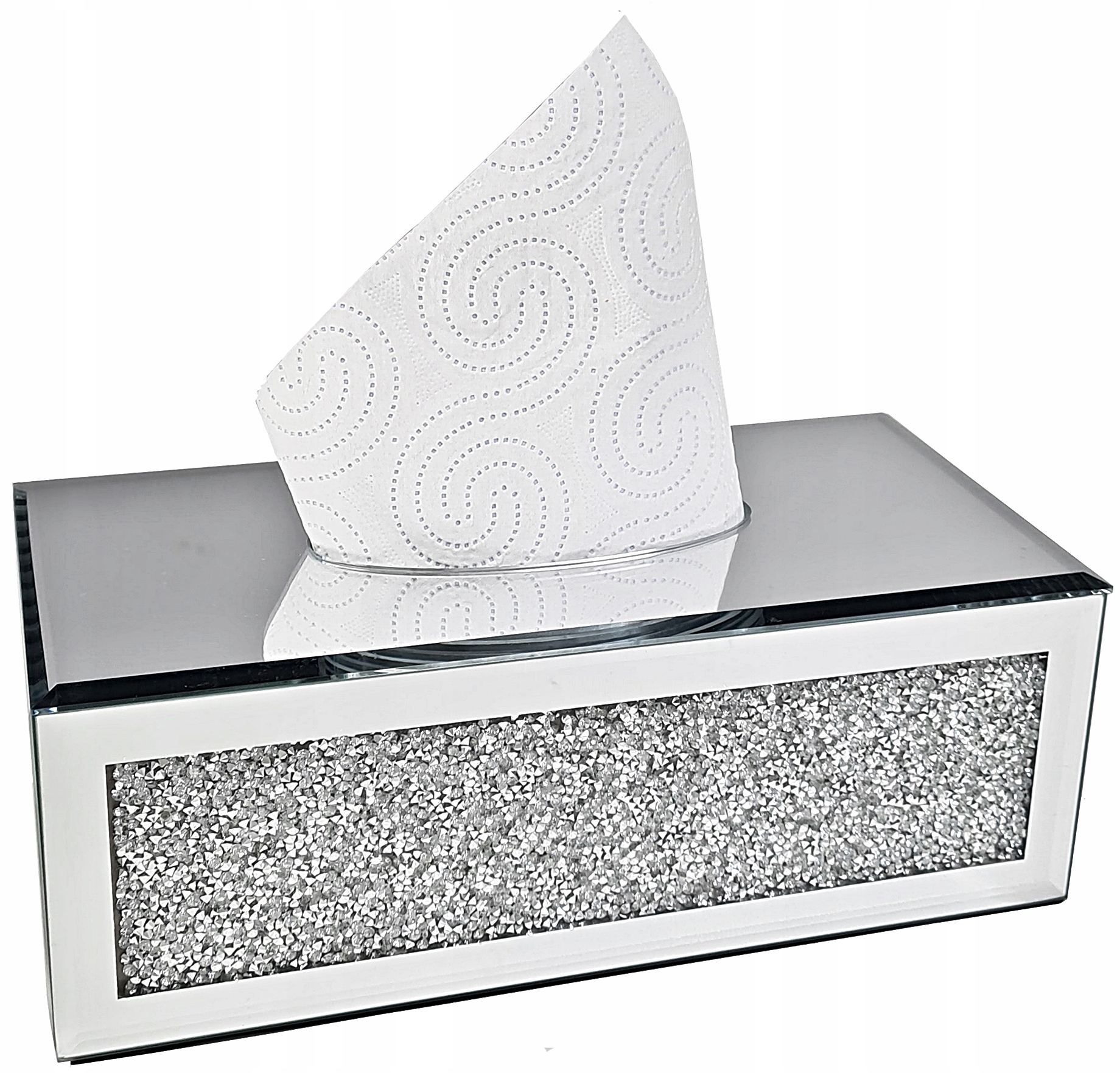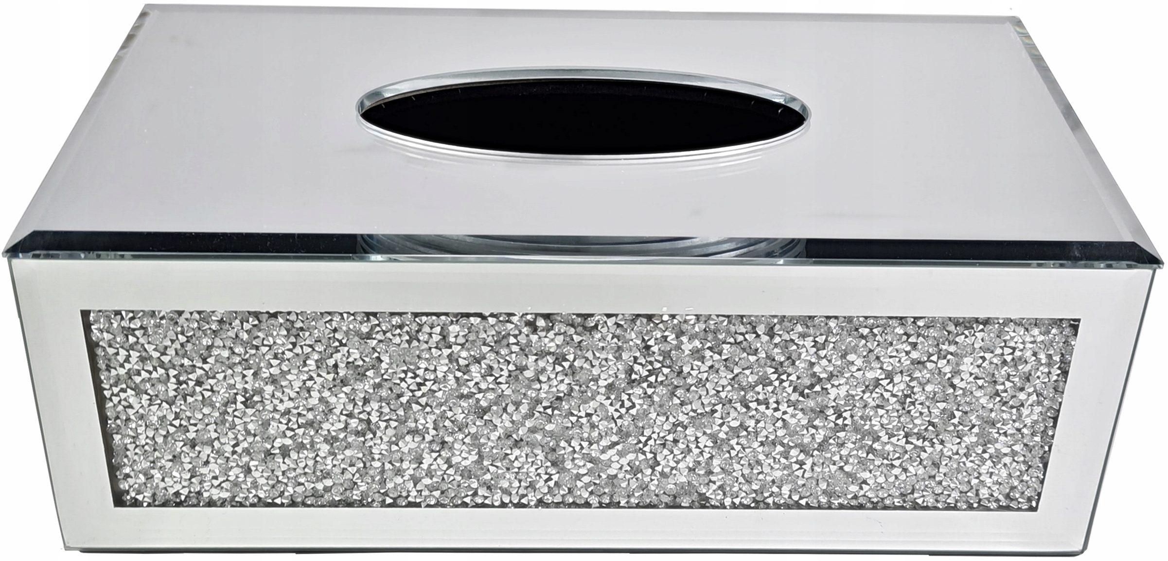 Коробка для салфеток с кристаллами по бокам (с каждой стороны) и зеркальной поверхностью. Дно контейнера пластиковое, внутри бархатное. Отверстие овальной формы.