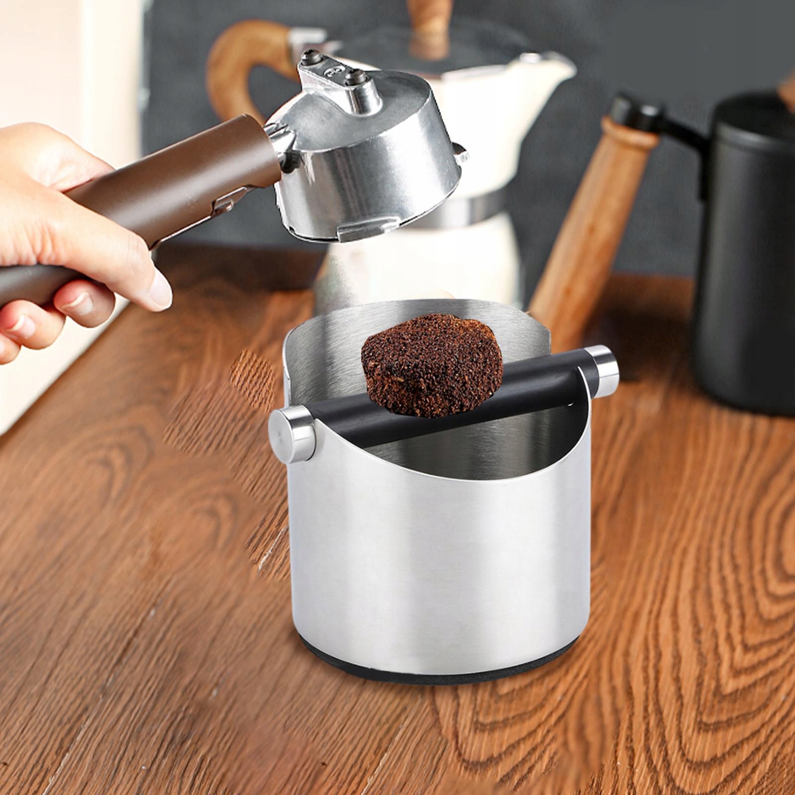 - ✔️Контейнер для сбора кофе изготовлен из нержавеющей стали, прочный и прочный. прочный, толстый и прочный материал поглощает звук удара, контейнер для отходов оснащен съемным мягким силиконовым стержнем, который облегчает высыпание гущи из фильтра, Espresso Knock Box обязательно поможет станет настоящей достопримечательностью на вашей кухне!