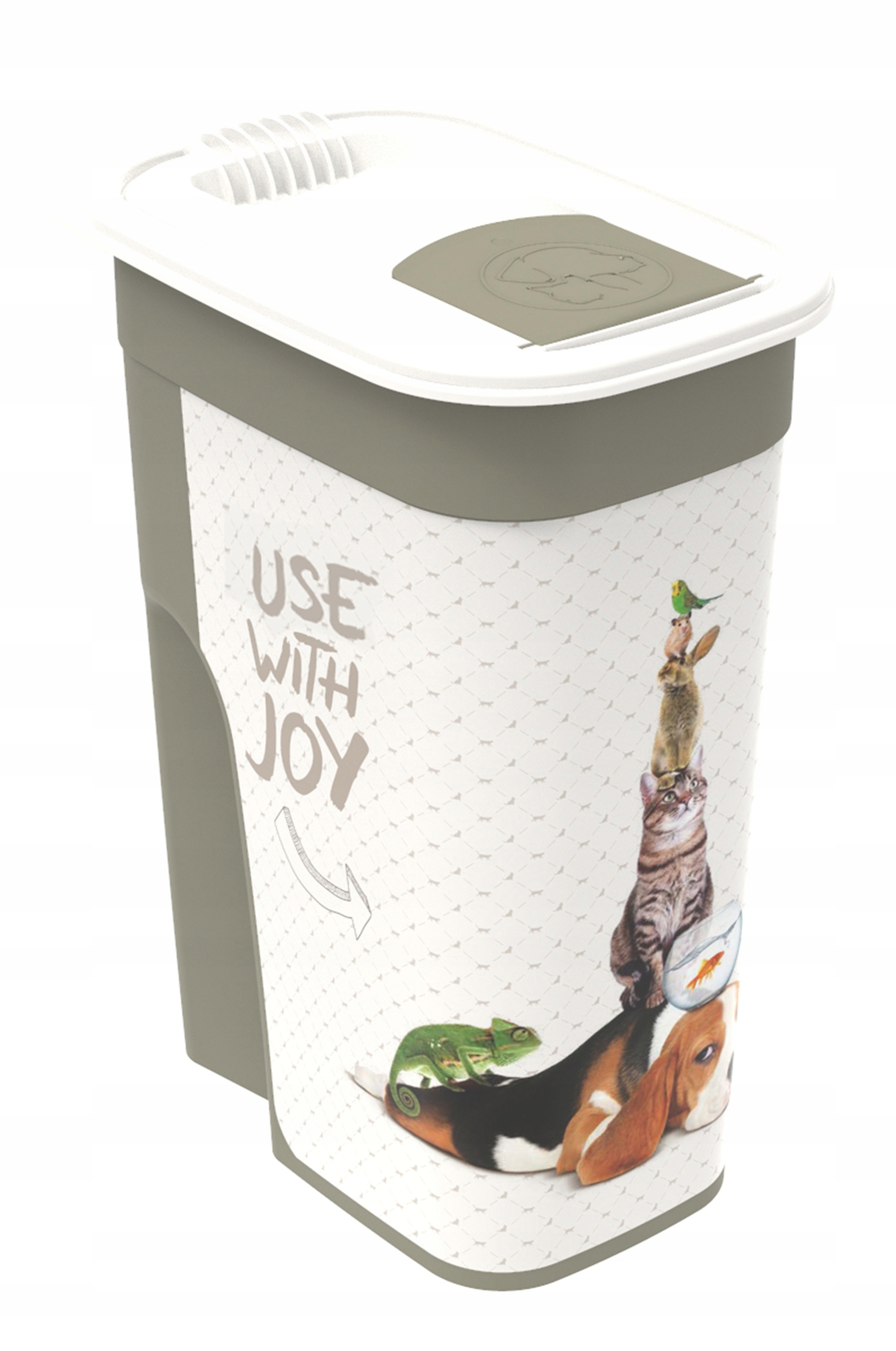 Контейнер имеет удобное в использовании отверстие (может фиксироваться) для облегчения дозирования сухого корма и углубление, образующее ручку. Он изготовлен из пищевого материала и имеет объем 4,1 литра.Благодаря размеру контейнер удобно мыть в посудомоечной машине.