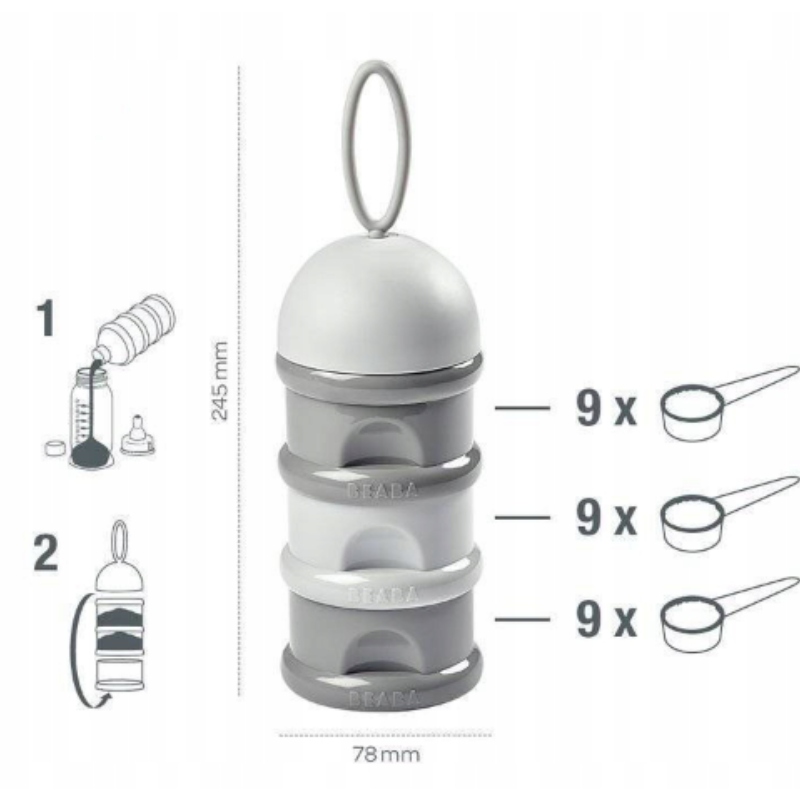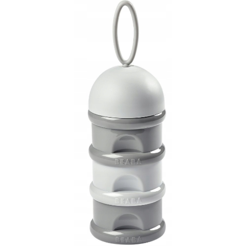 - Компактный набор из 3-х контейнеров для хранения сухого молока от французского бренда BEABA – идеальное решение для родителей, которые хотят всегда иметь под рукой порции сухого молока для своего ребенка. В комплект входят три контейнера разного цвета: один серый и два пепельно-серых, их общая емкость составляет 270 мл – 90 мл каждый. Это позволяет хранить достаточно сухого молока для прогулки, путешествия или ночного кормления.