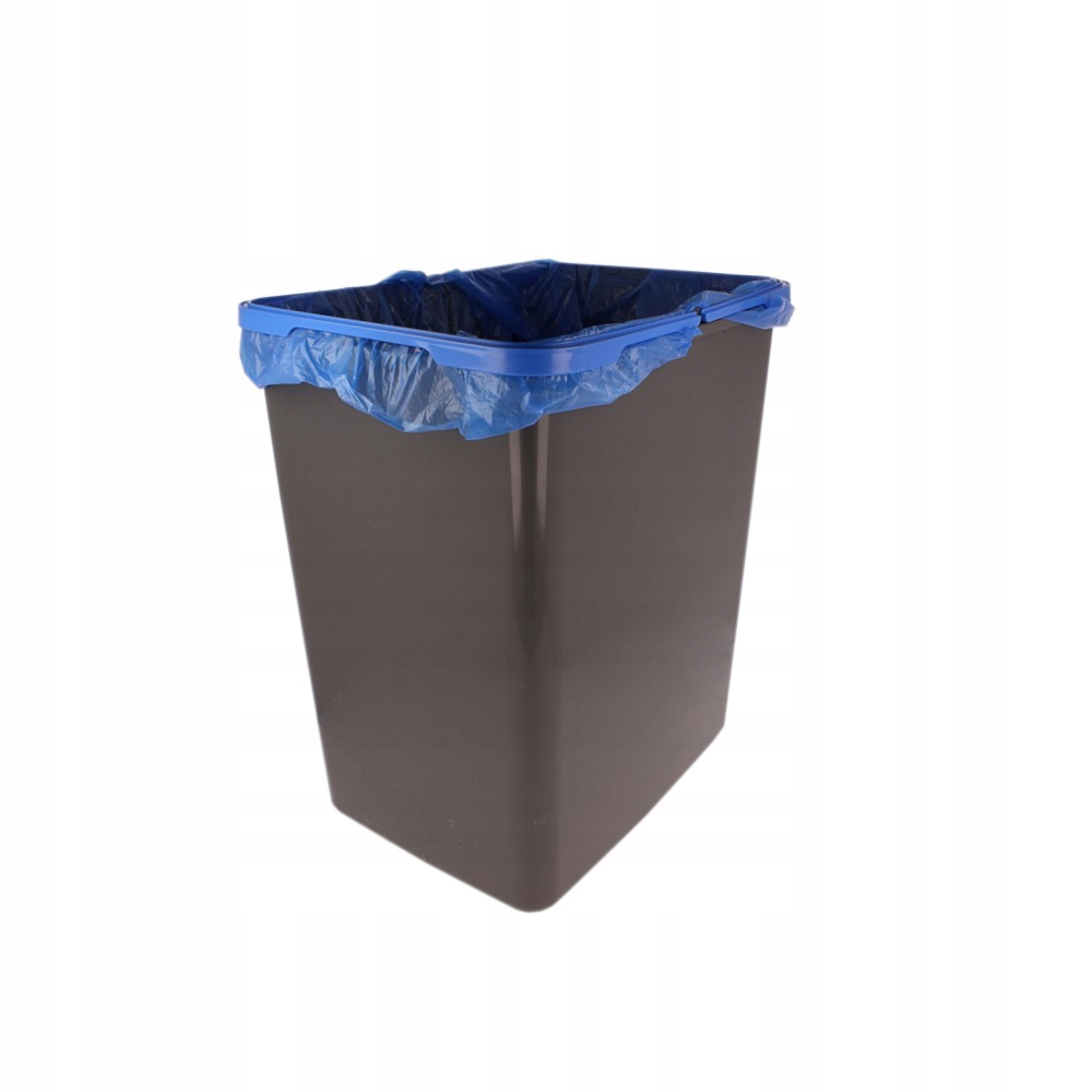 Удобный контейнер для повседневного использования, имеет синие ручки, которые также используются для хранения мешка для мусора.