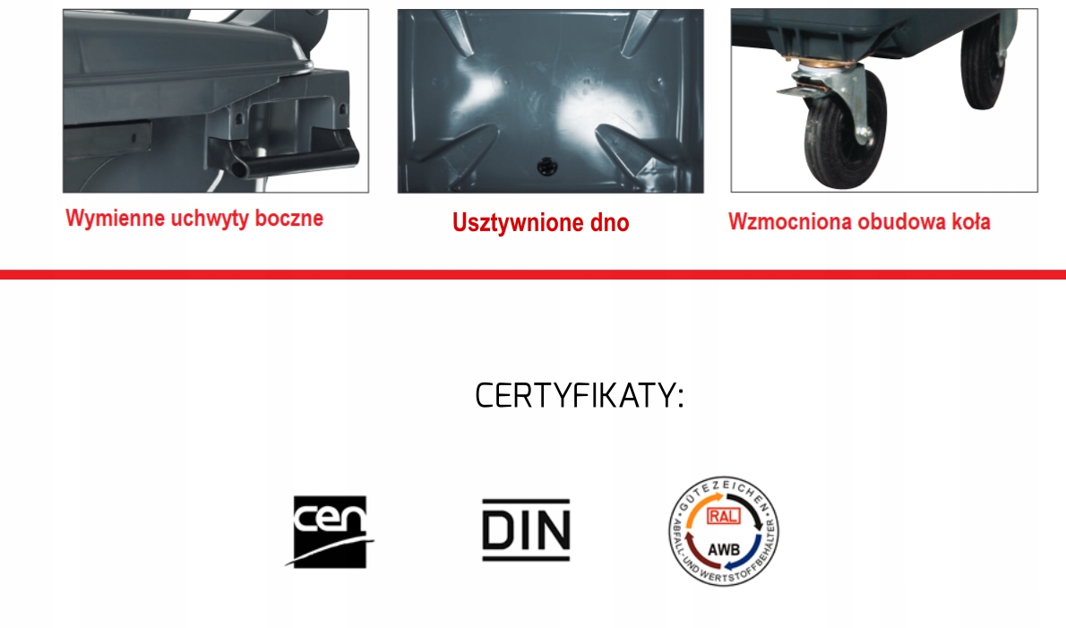 Контейнер для мусора изготовлен изготовлены из специально созданного пластика, устойчивого к солнечному свету, температурам и химикатам. Контейнеры соответствуют стандартам ЕС – EN 840, EN840-5/6 C и получили соответствующие сертификаты шумозащиты с маркировкой CE.
