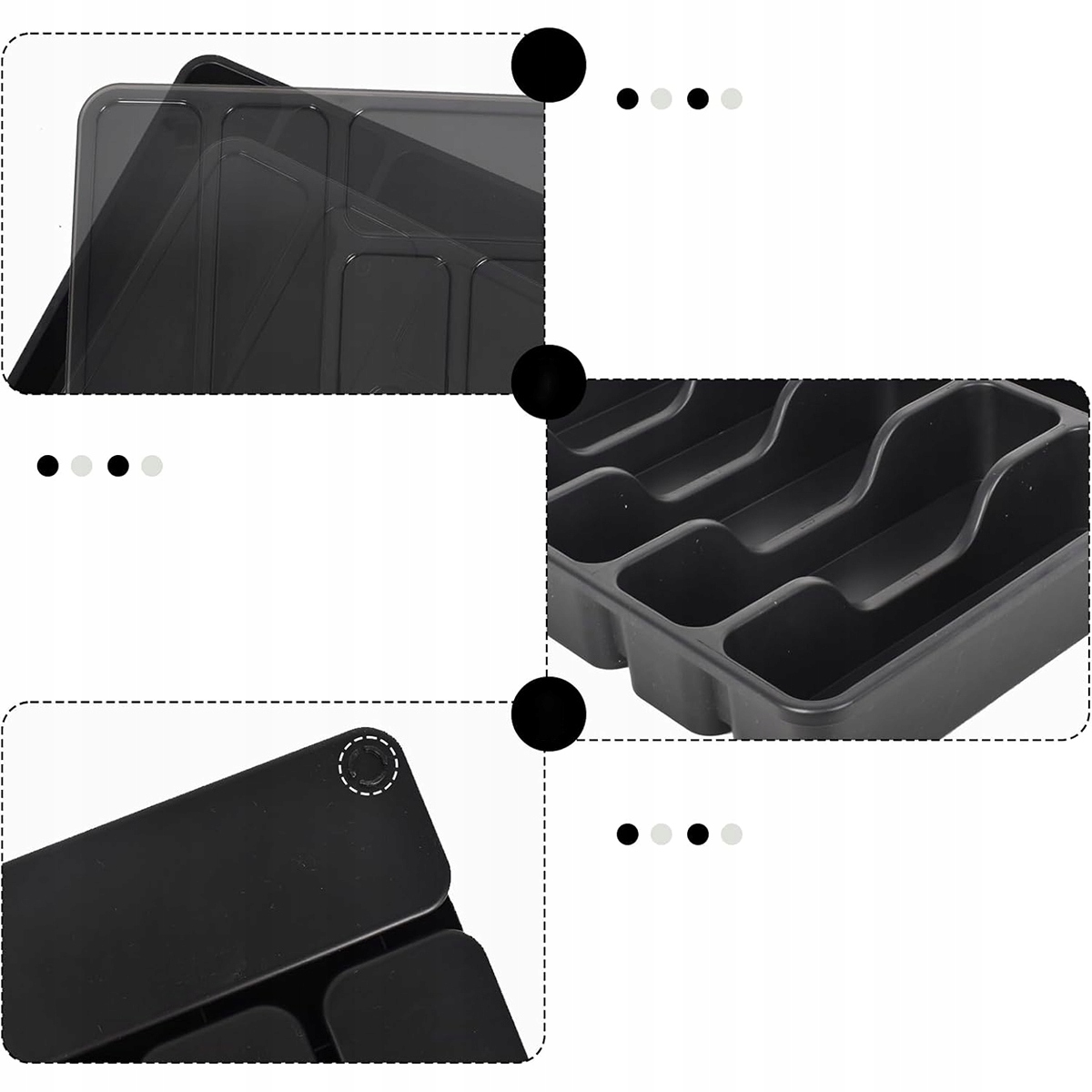 Организатор имеет 6 отсеков, включая 2 длинных секция для ножей и крупных столовых приборов и 4 средних участков на ложку, вилки и меньшие посуды.