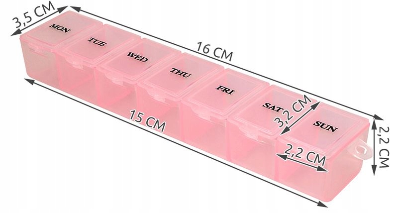 Каждый из семи отсеков описан с указанием дня недели на английском языке, чтобы вы могли легко прочитать, какое лекарство вам следует принять в тот или иной день. Контейнер также имеет цепочку, позволяющую повесить его на крючок или прикрепить к ключам.