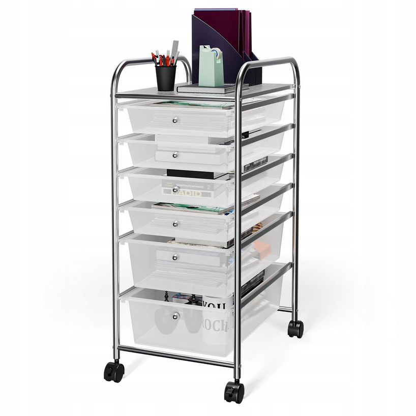 Металлический шкаф на колесах с шестью ящиками, представленный в нашем предложении, представляет собой изделие высокого класса. Прочные и прочные ящики из ПП сочетаются с прочным, антикоррозийным каркасом из хромированной стали, а верхняя часть оснащена металлической полкой для мелких предметов или украшений. Ящики, которые легко снимаются с каркаса, значительно облегчат как текущую работу, так и периодическую чистку мебели. Обращают на себя внимание четыре колеса, благодаря которым органайзер с выдвижными ящиками, даже доверху наполненный аксессуарами, можно легко и без особых усилий перевезти в любое место.