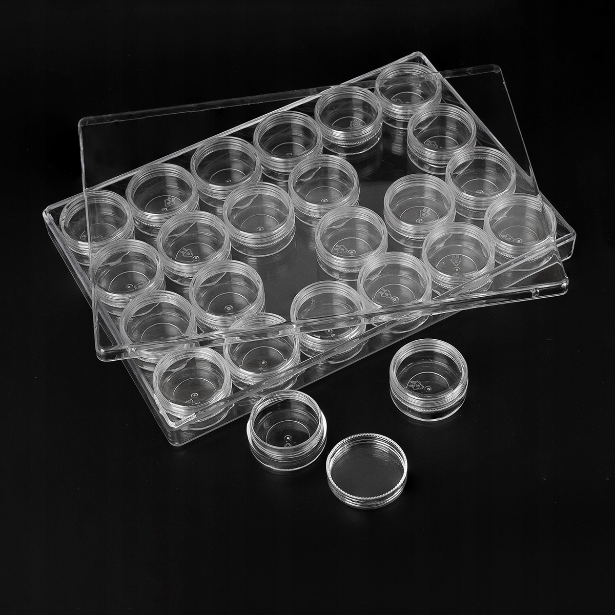 Жемчуг, пудра, стразы или различные аксессуары из полистирола. В контейнере 24 пластиковые баночки с крышками.