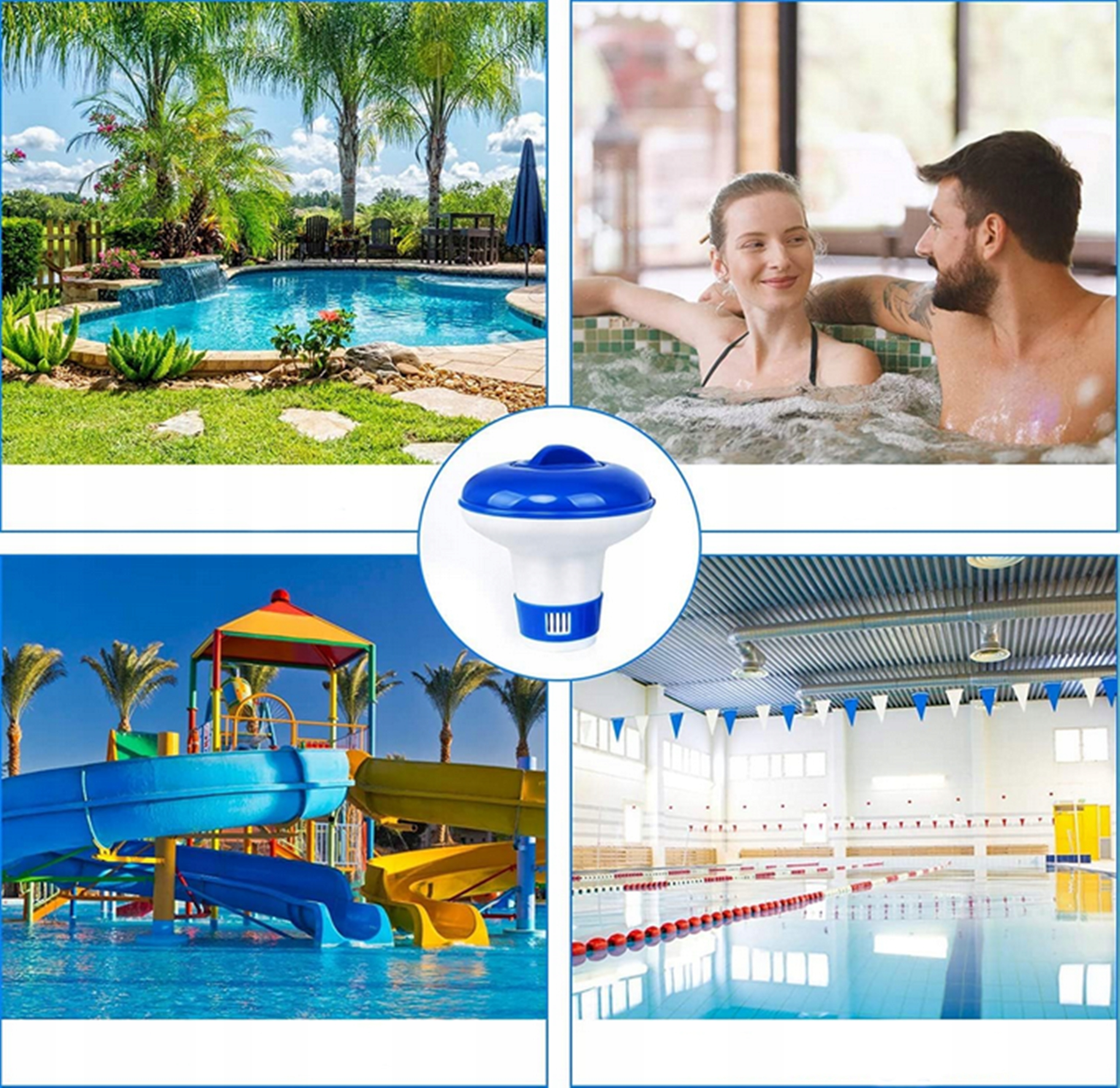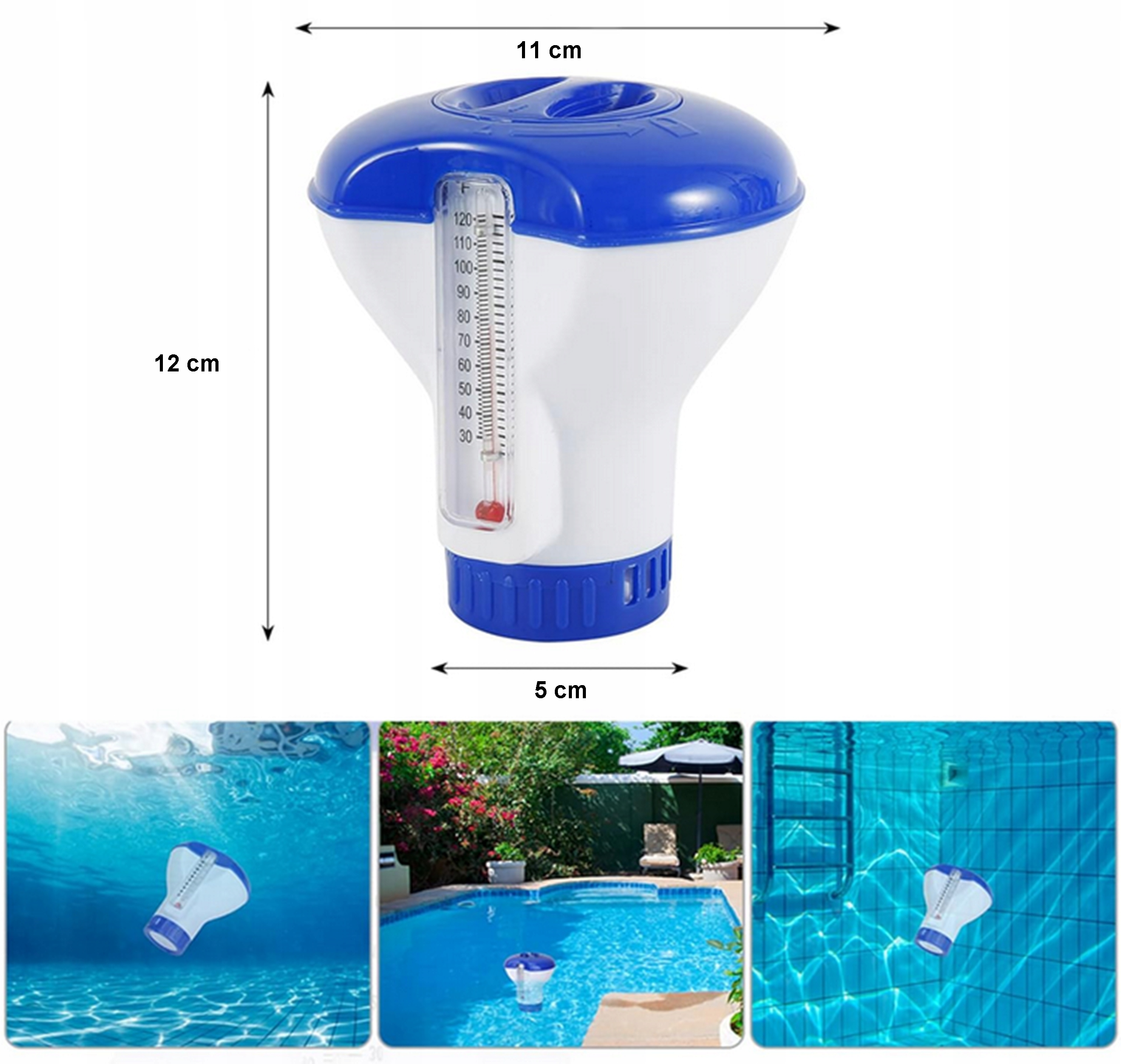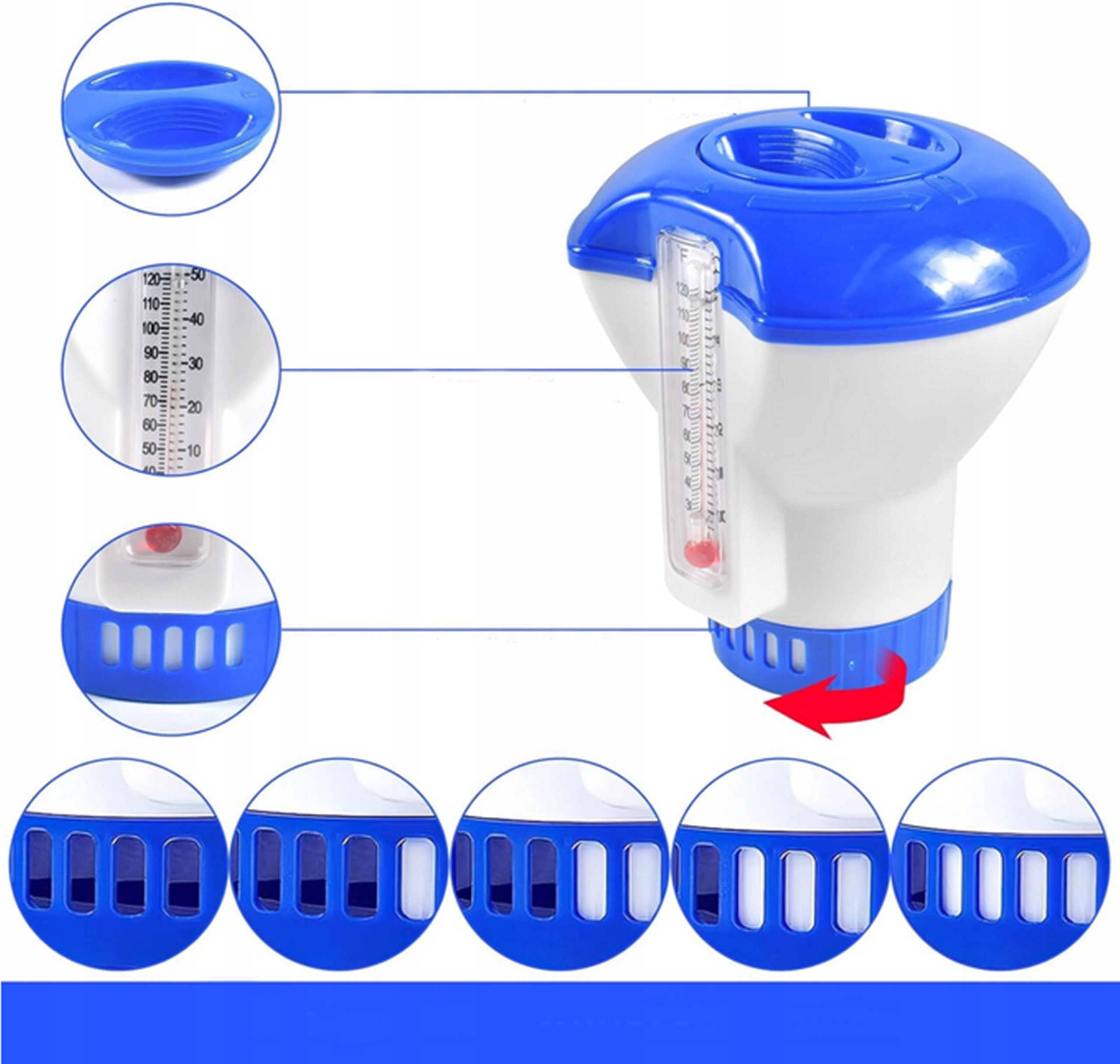 Практический , плавающий дозатор хлора со встроенным термометром является идеальным аксессуаром для садового бассейна. Включает одновременное Дозирование химии бассейна и контроль t Вода Empragation , что увеличивает Comfort и безопасность купание.