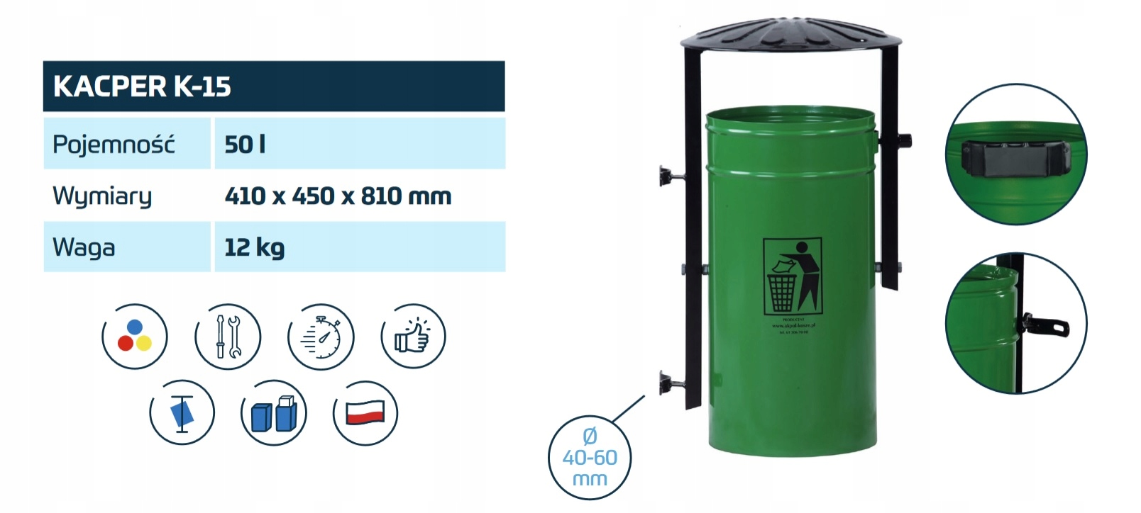 Уличный мусорный контейнер KACPER K-15 отличается высоким качеством, эстетичным исполнением и высокой прочностью. Изготовлен из электролитически оцинкованного листового металла, толщина контейнера составляет 1,0 мм, толщина крыши — 1,5 мм. Компактная, закрытая и оцинкованная конструкция отличается высокой стойкостью к физико-химическим взаимодействиям металла с окружающей средой и высокой усталостной прочностью материала.