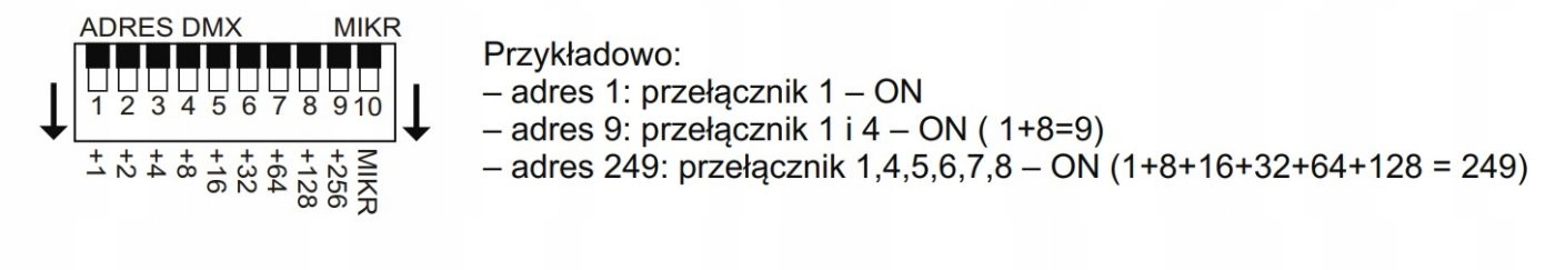Используйте микропереключатель («палочки») на боковой стороне устройства, чтобы установить адрес DMX. Переключатели с 1 по 9 устанавливают адрес. Каждый переключатель имеет номер, например +32. Адрес DMX представляет собой сумму чисел рядом с установленными переключателями (по стрелке). Переключатели следует устанавливать кончиком ручки или другого тонкого предмета. Последний переключатель (цифра 10) отвечает за работу микрофона. Если он установлен, контроллер будет использовать микрофон для синхронизации эффектов с музыкой.