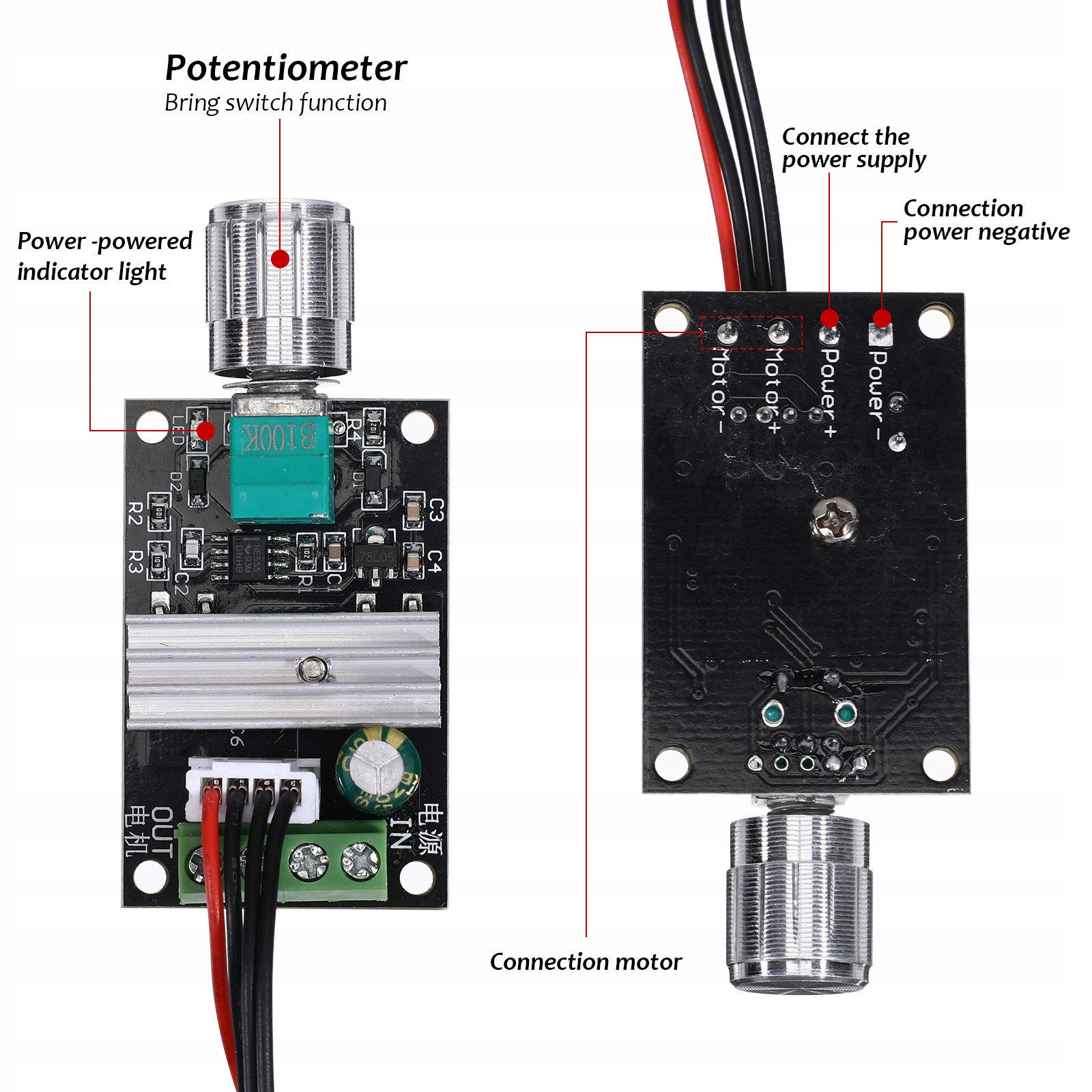 <р>1. Подключите провода, см. схему подключения. <р>2. Включите питание и отрегулируйте потенциометр. <р>3. Светодиодный индикатор указывает на включение питания и двигатель.Предупреждение: не меняйте местами положительную и отрицательную силовые нагрузки. Это повредит драйвер!
