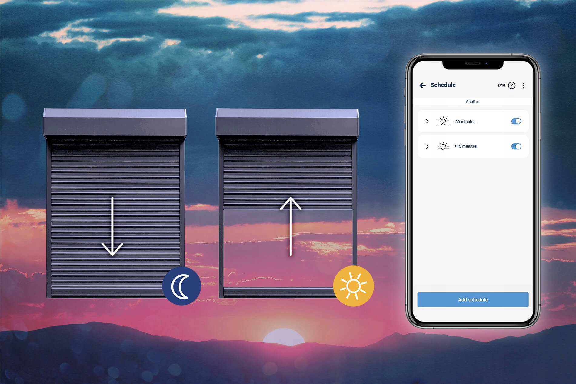 Расписание с функцией астрономических часов позволяет вам управлять в заданное время, а также при восходе и закате солнца в зависимости от вашего географического положения - вы всегда можете управлять жалюзи одновременно с день независимо от времени года.