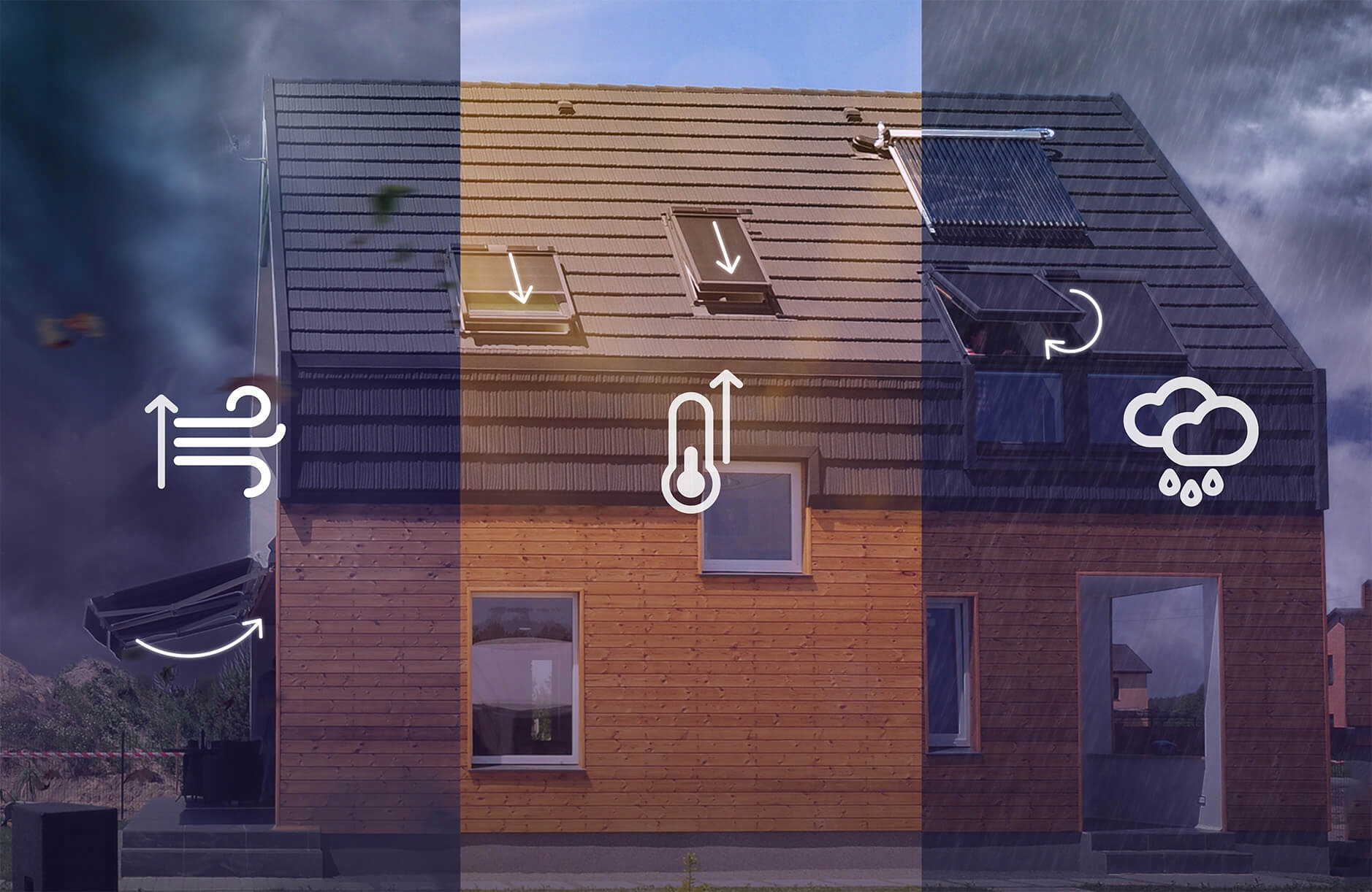 - Возможность управлять мансардным окном, навесом на балконе, навесом на террасе, экраном проектора и даже шторами