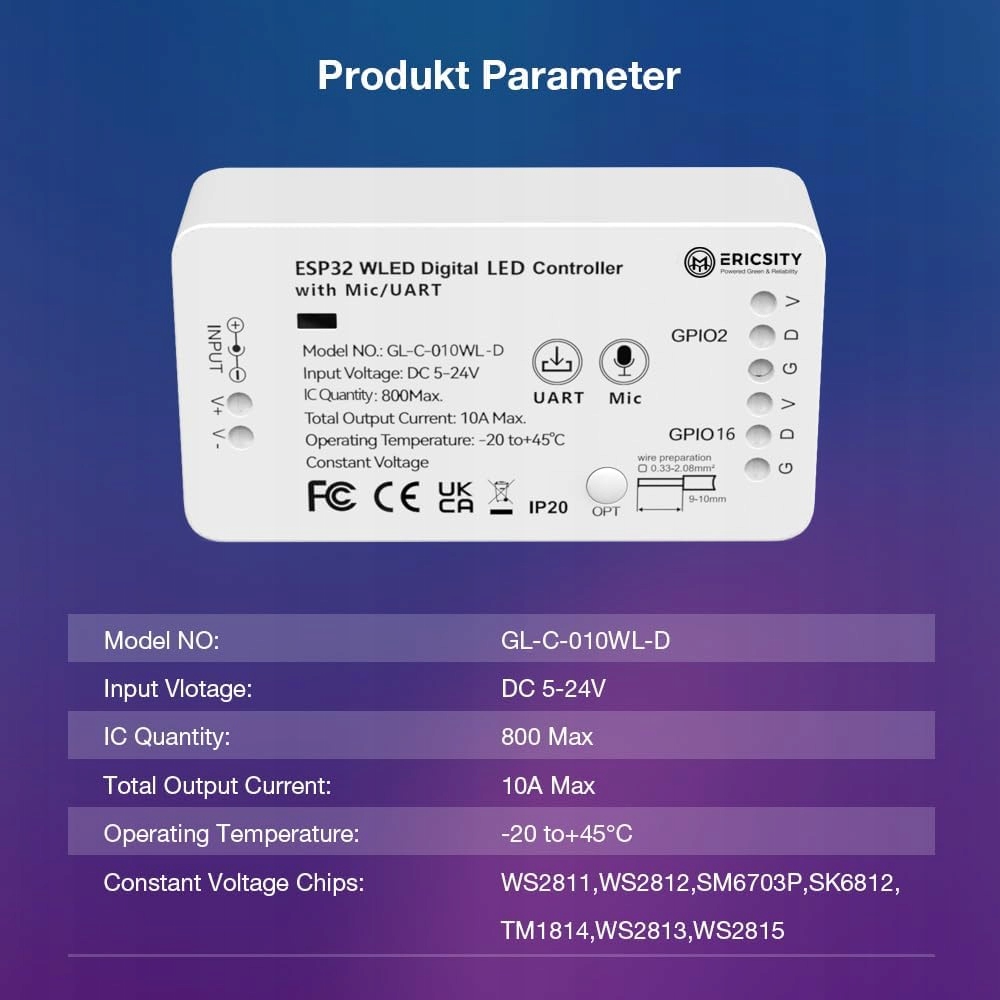 KONTROLER LED DC 5-24V Z MIKROFONEM ESP32 NeoPixel SPI WiFi Smart 10A