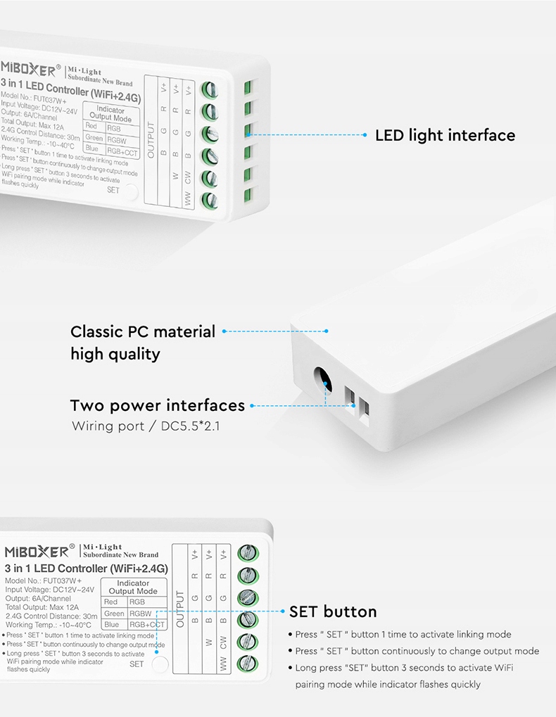 Модель FUT037W+ — это новейшая версия зонного контроллера MiLight для светодиодных лент RGB, RGBW и RGB CCT с напряжением 12В-24В. Уменьшенные габариты, увеличенная мощность и возможность изменения частоты ШИМ-модуляции делают его на данный момент непревзойденным и безотказным решением такого типа на рынке.