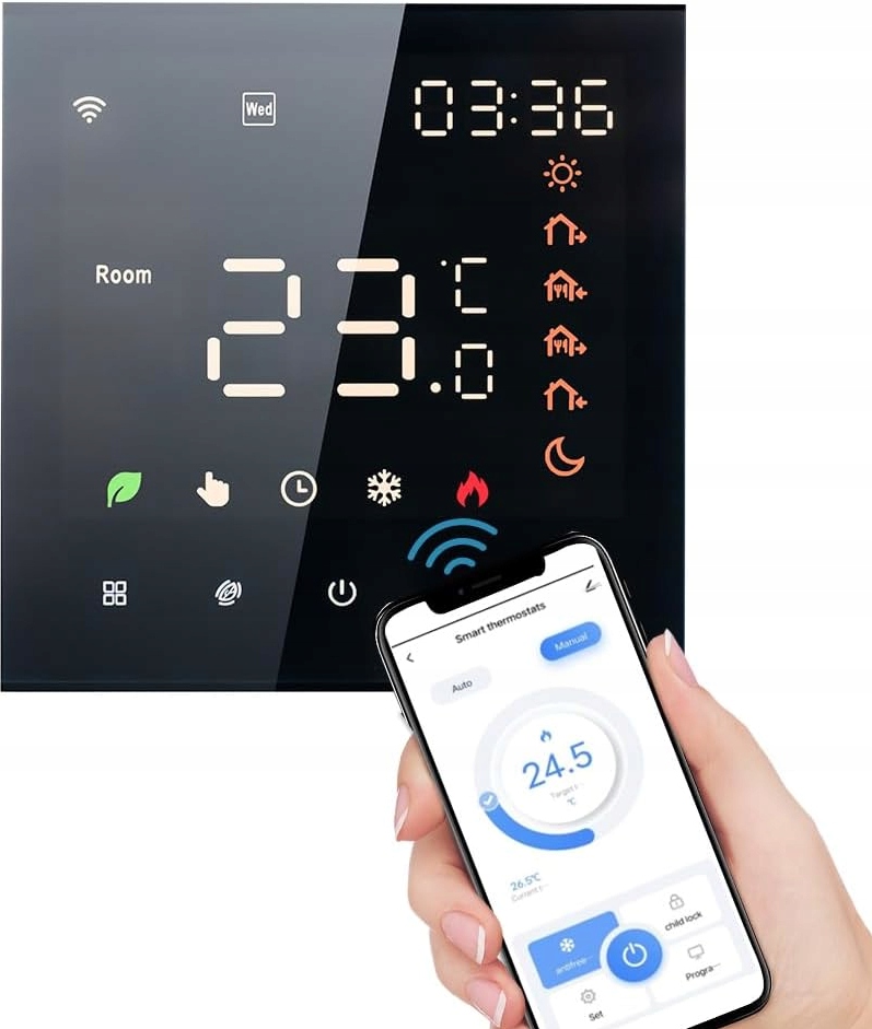 - пульт дистанционного управления : контролировать температуру в вашем доме из любой точки мира, используя приложение Tuya Smart или Smart Life. Жизнь.