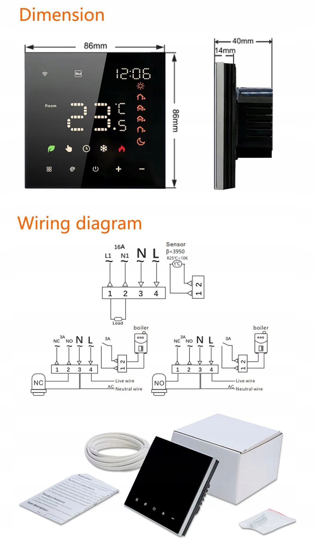 - Точные датчики : встроенный -ин -датчик температуры и дополнительный датчик пола NTC3950 10K (включены) Убедитесь, что точность измерения до ± 0,5 ° C.