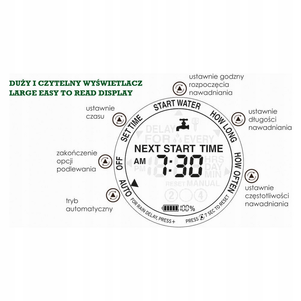 - Контроллер имеет: большой и четкий дисплей; быстрый выбор ручного полива; индикатор заряда батареи; интуитивно понятный пользовательский интерфейс; простая настройка и программирование; дисплей СЛЕДУЮЩЕЕ ВРЕМЯ ЗАПУСКА сообщает, когда должна запуститься следующая программа.