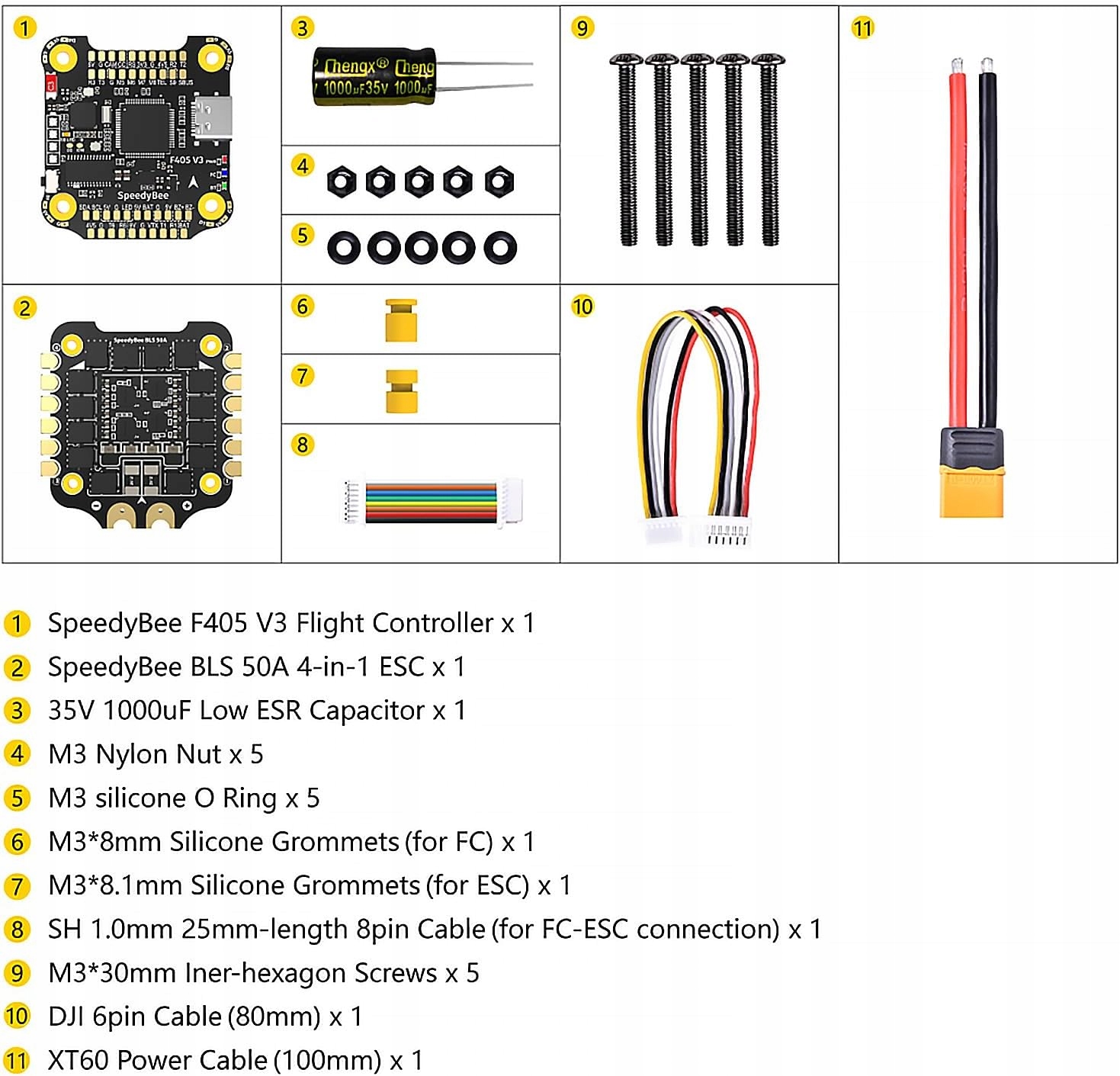 Полетный комплект SpeedyBee F405 состоит из контроллера полета F405 V3 FC и регулятора скорости 50A 3-6s BLHeli_S 4-в-1 ESC размером 30x30 мм. Эта модель допускает подключение и настройку через Bluetooth, имеет встроенные 4-уровневые индикаторы заряда батареи, фильтрующий конденсатор, встроенный барометр и множество других функций.